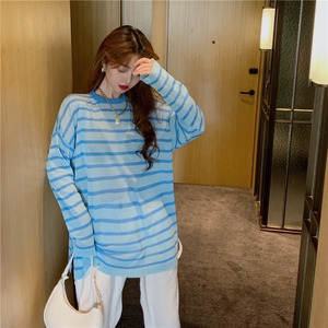 ストライプTシャツ ロングスタイルルーズ薄手トップス サマー ピンク 夏物 ブラックストロベリース14944699066