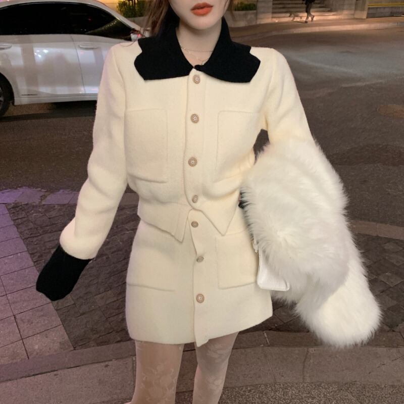 ショートニットセーター スリムカーディガンジャケット スプリングカラートップス 春物 ブラックストロベリース92658097054
