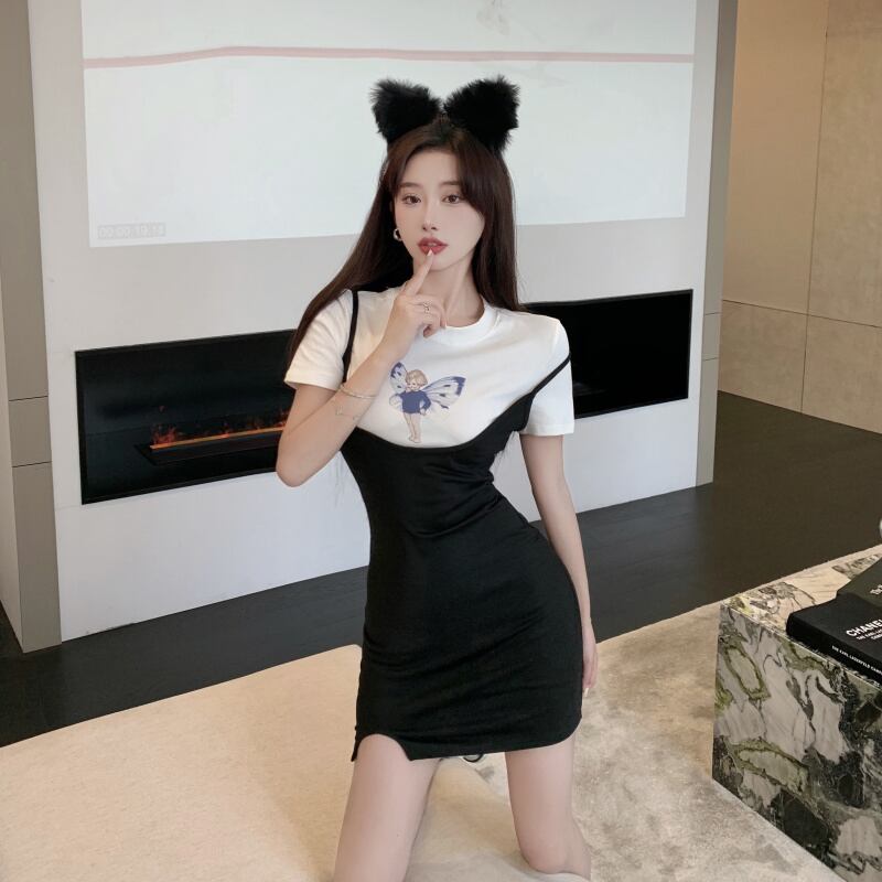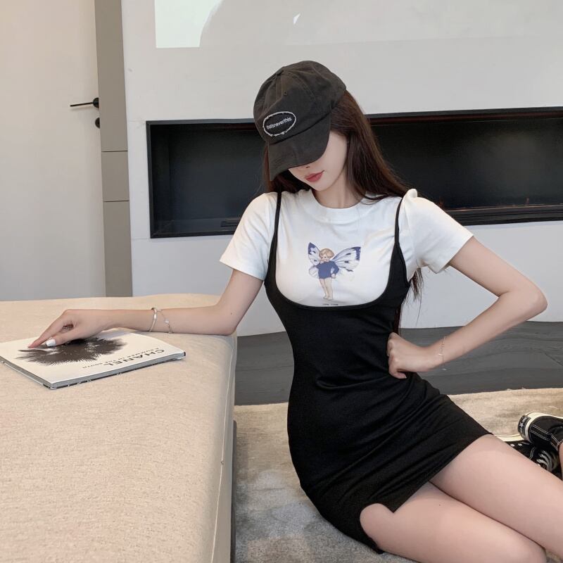 ブラックドレス サマースリムスリットショートスカート 夏物 ブラックストロベリース6190012149