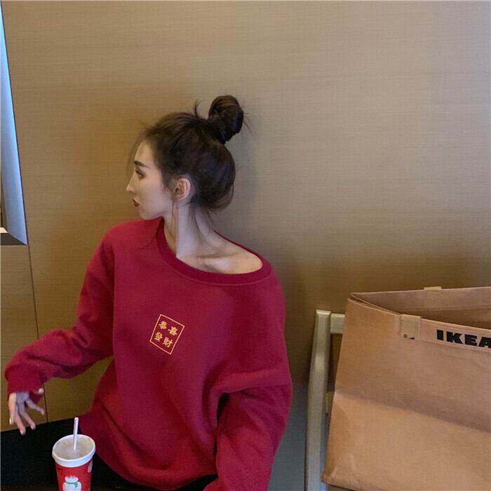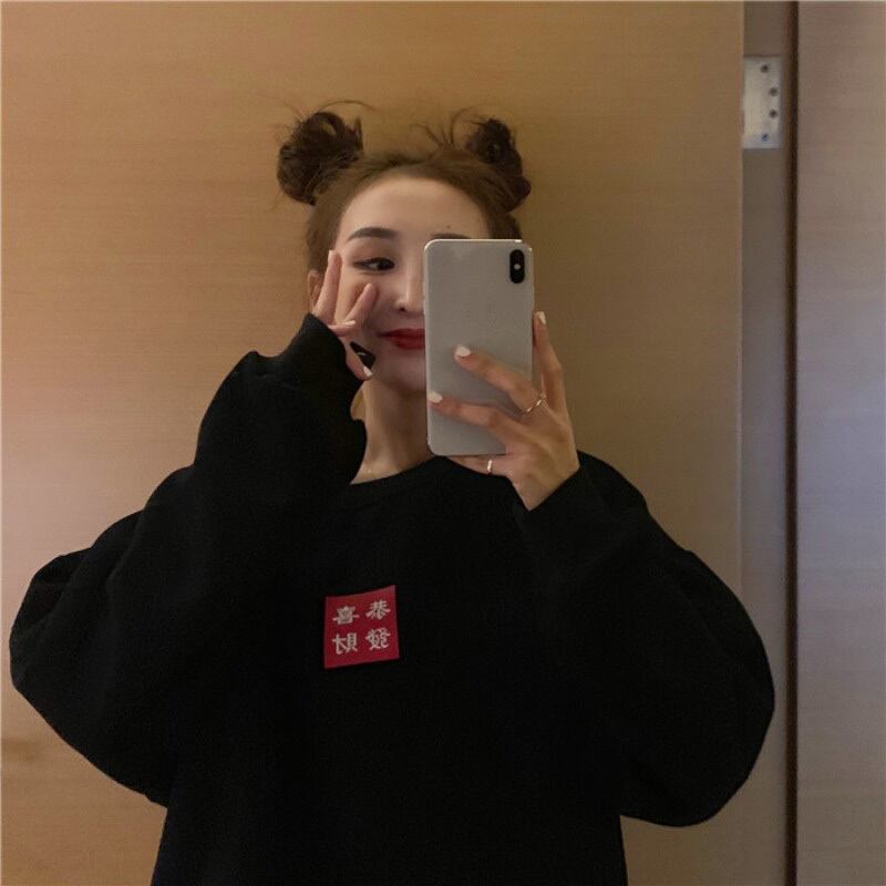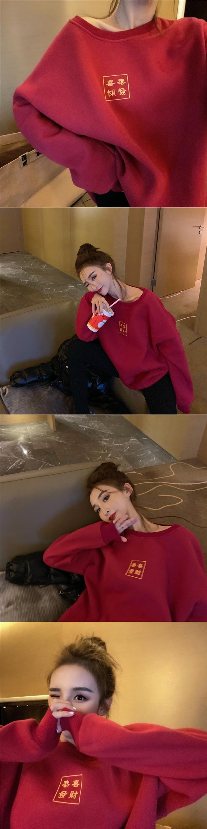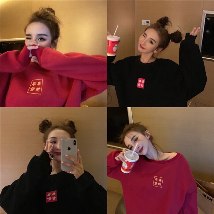 スウェット ルーズレッドラウンドネックプルオーバー トップス オータムウィンター 秋物 冬物 Oネック ブラックストロベリース36399059812