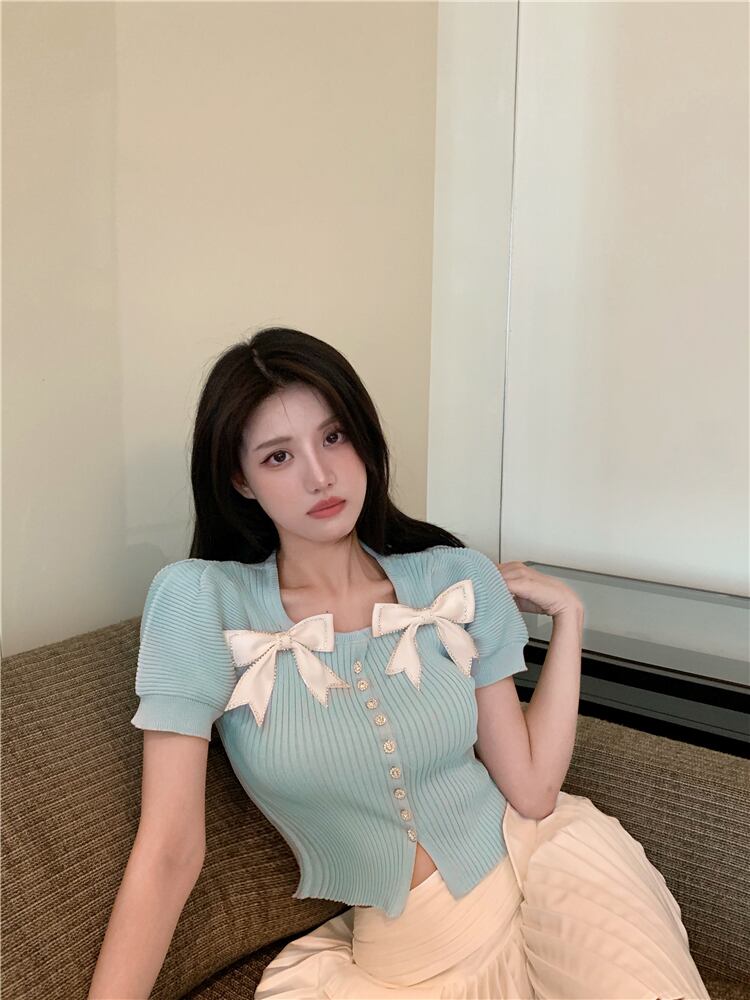 ニットカーディガンショートジャケット サマートップス リボン 大人ガーリー スウィート キュート カジュアル 夏物 ブラックストロベリース68377541006
