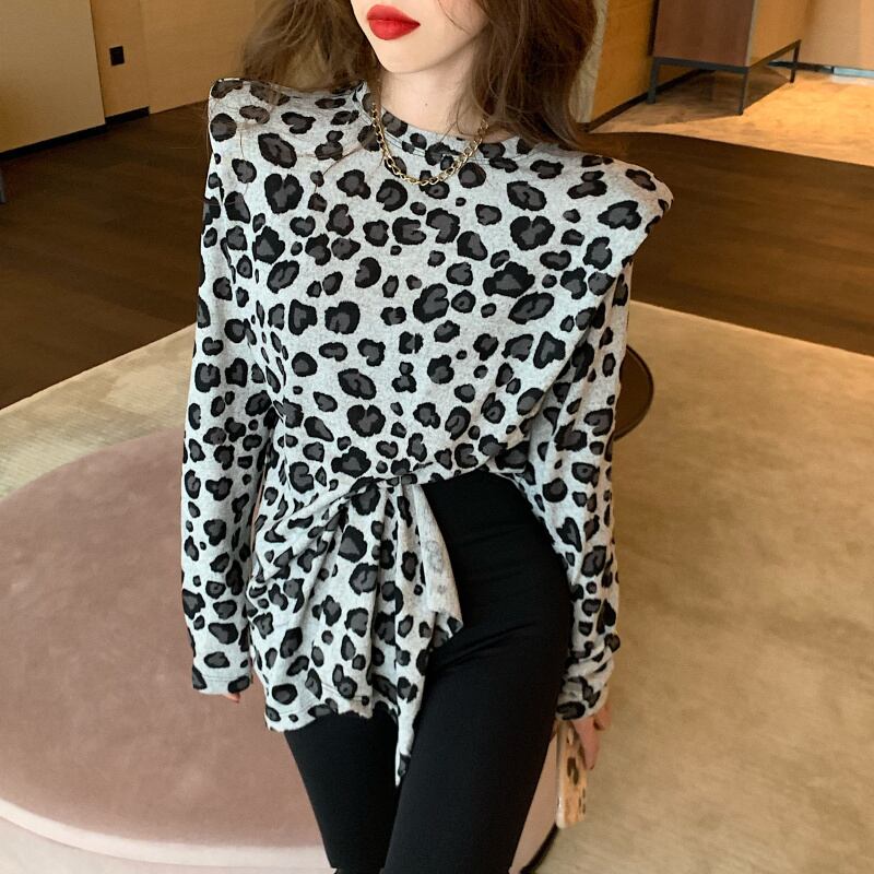 Tシャツ シャツ レオパードプリント柄ルーズスプリングスタイルトップス ロング 春物 ブラックストロベリース75532655710