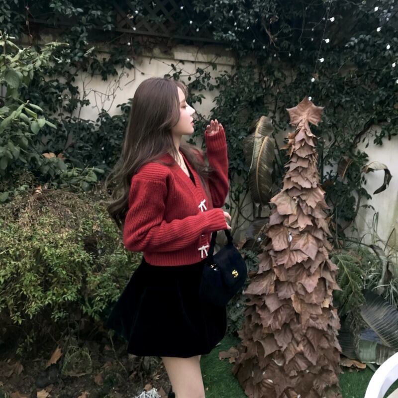 セーター スリムVネックスタンダードレッドニットジャケット スプリングラインストーンカーディガン レトロ 春物 ブラックストロベリース90030624038