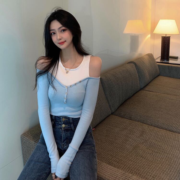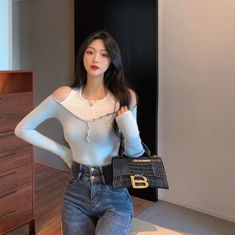 ニットセーター シャツ スプリングトップス 春物 オフショルダー ステッチ ブラックストロベリース8538829161