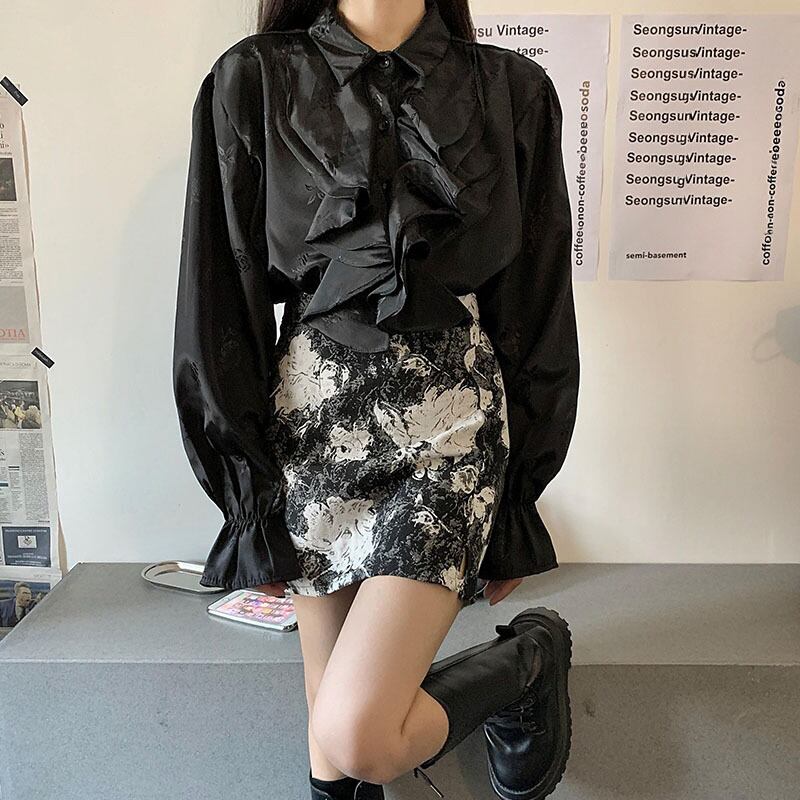 シャツ ルーズブラックスプリングスタイルブラウス ロング 春物 ブラックストロベリース29556059308
