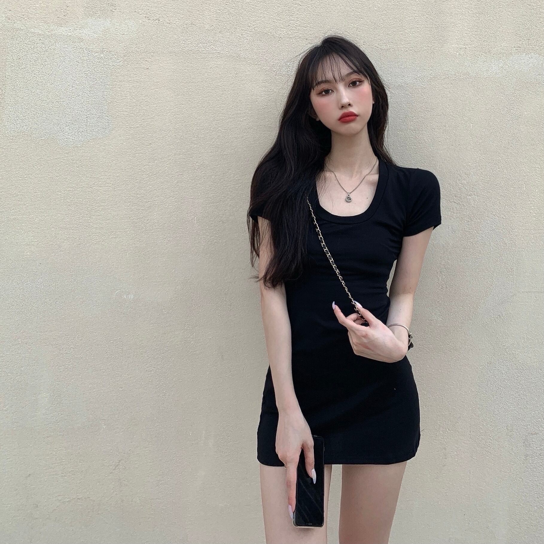ブラックスリム半袖スリーブドレス ショート ハーフスリーブ ブラックストロベリース84674959771