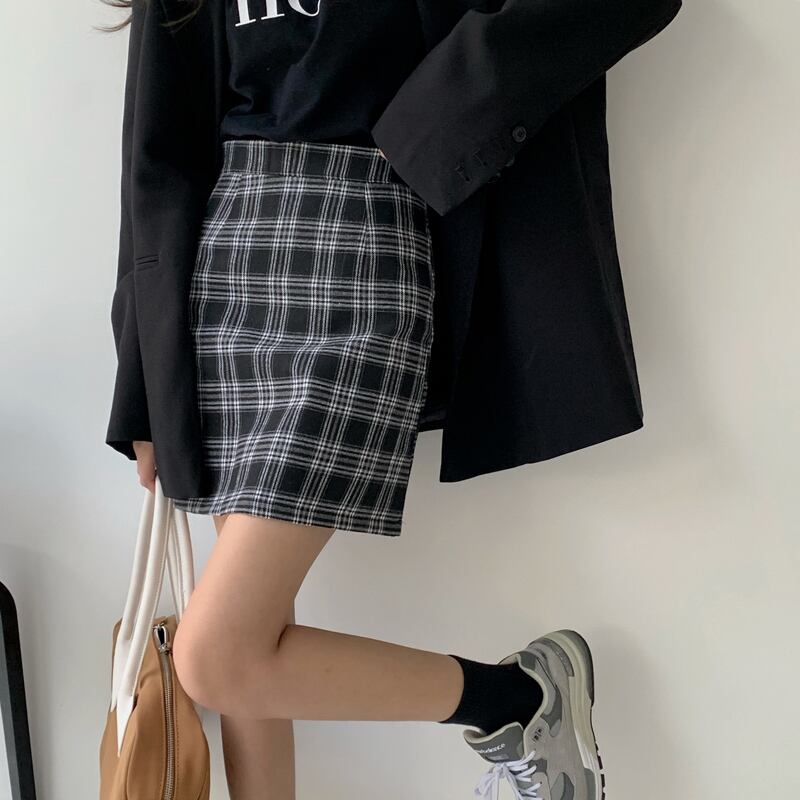 格子柄スカート ハイウェストウェストショートスプリングスタンダード レトロ 春物 ブラックストロベリース19956628573