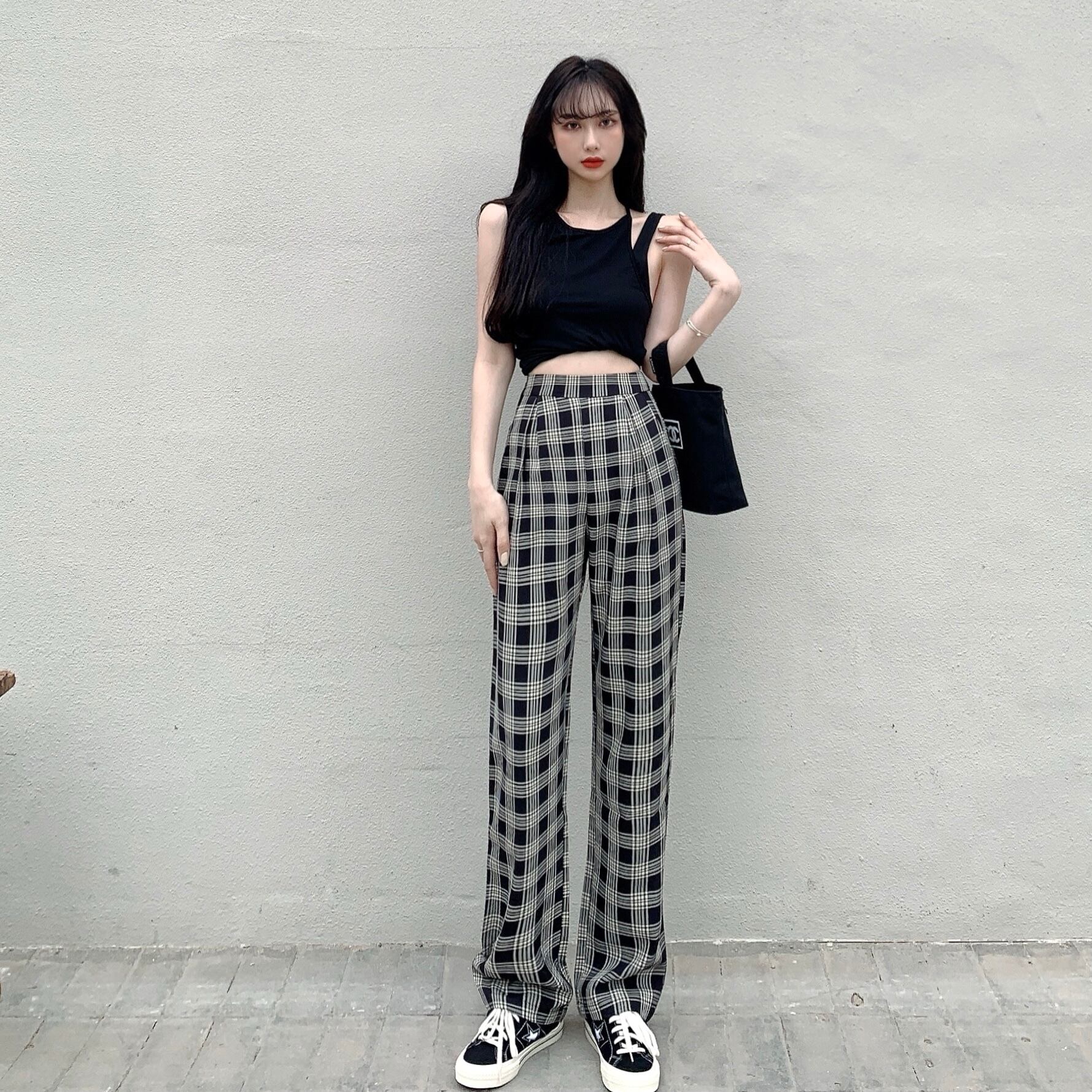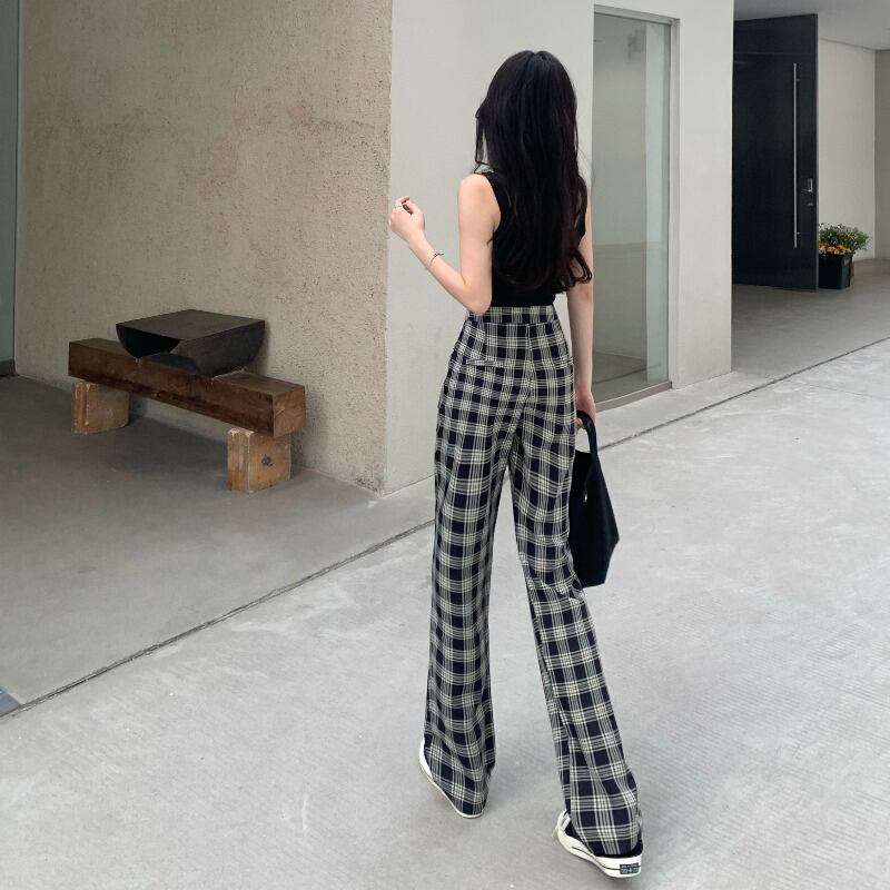 格子柄カジュアルパンツ サマー薄手ハイウェスト 夏物 ブラックストロベリース7006098959