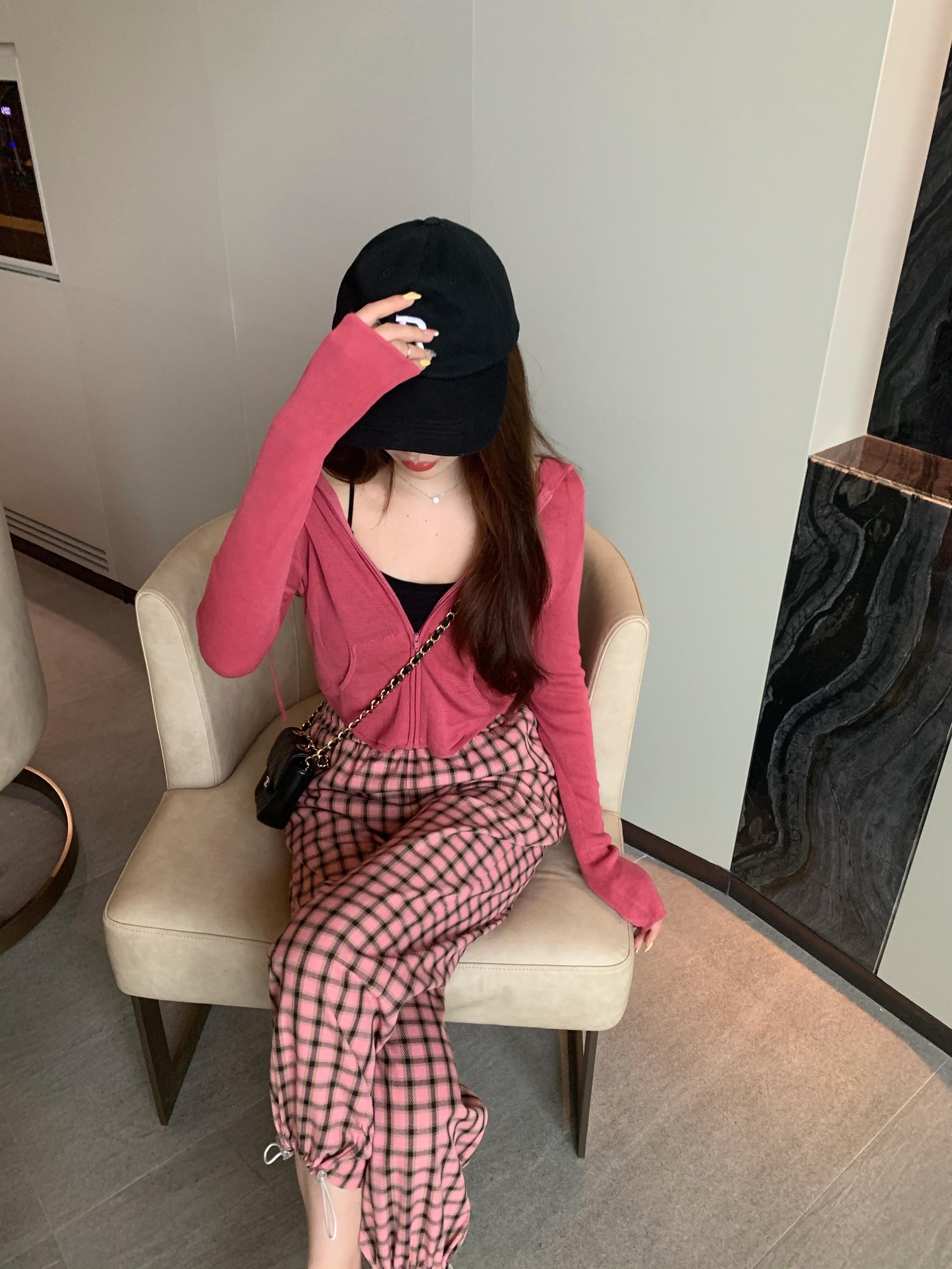 ブラックフードカーディガンスリム薄手ニット長袖スリーブサマースタイル格子柄ギャザー ショート ロング 夏物 ブラックストロベリース28367466333