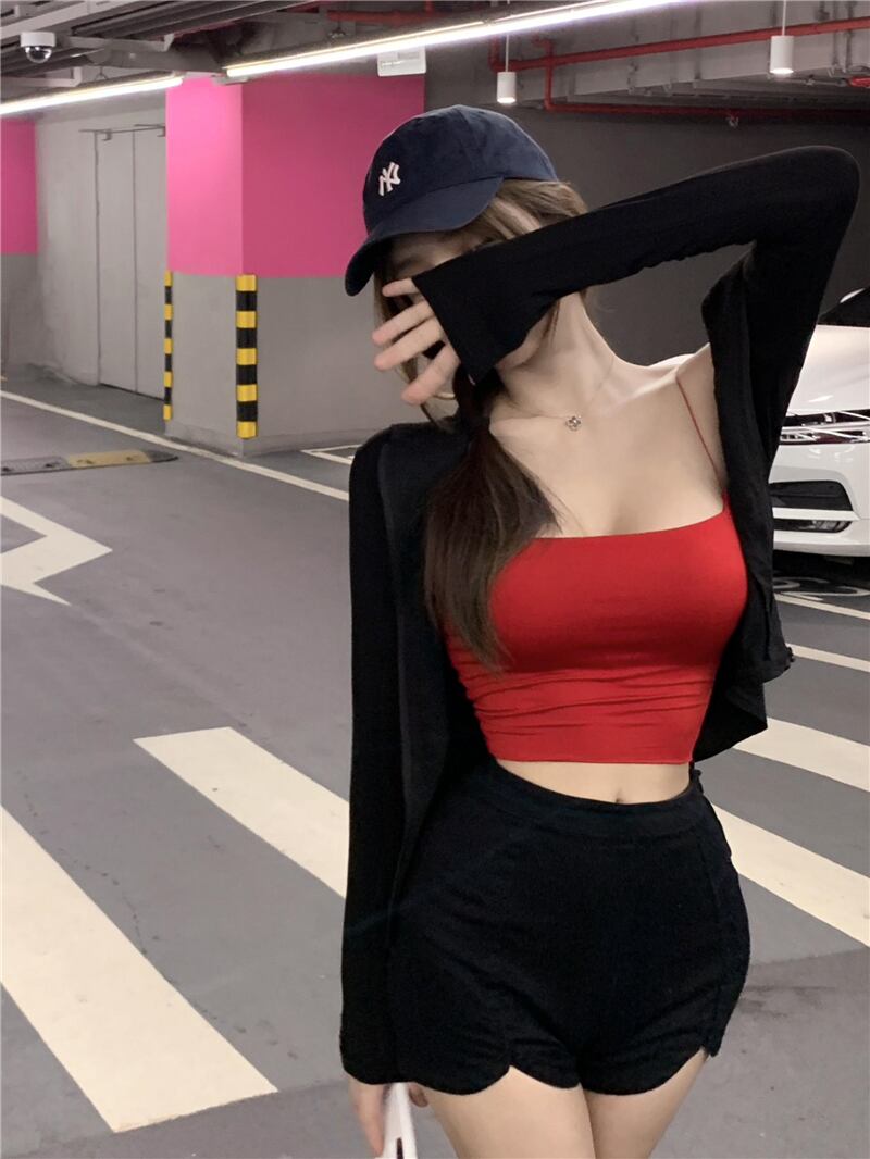 ブラック薄手フードセーター ジッパージャケット トップス ショーツ ブルマー ブラックストロベリース75187346092