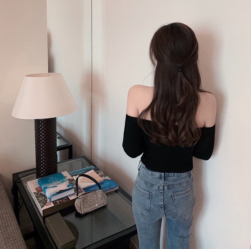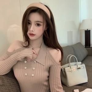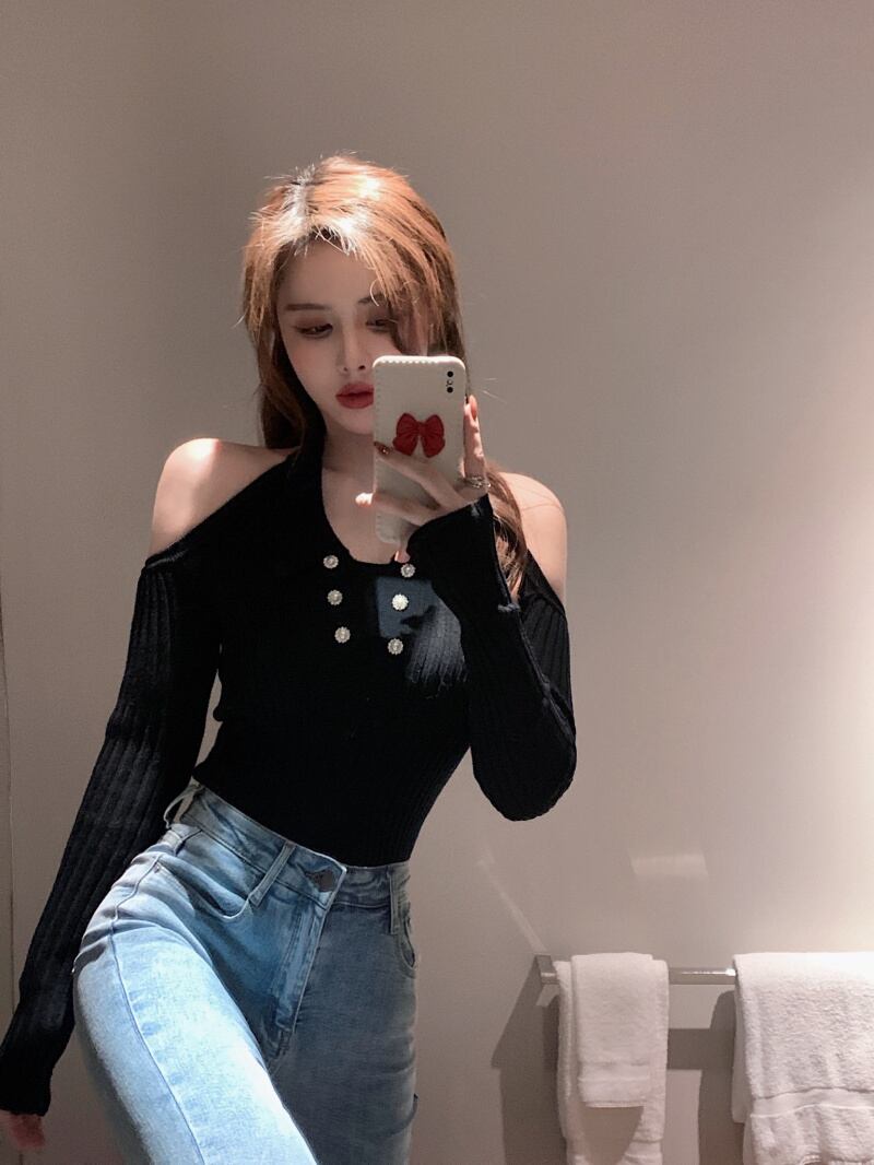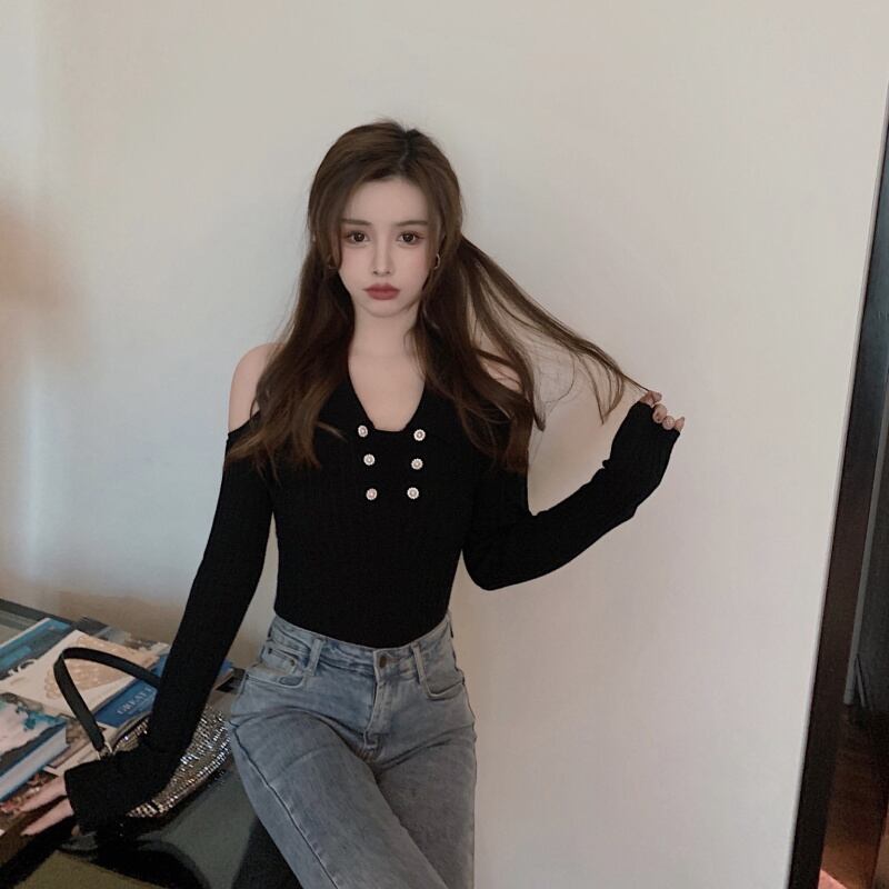ニットセーター ショートシャツ スプリングブラックトップス 春物 オフショルダー ブラックストロベリース5090121978