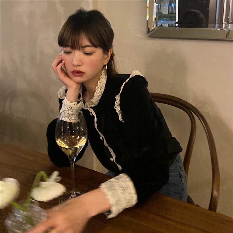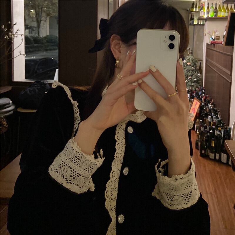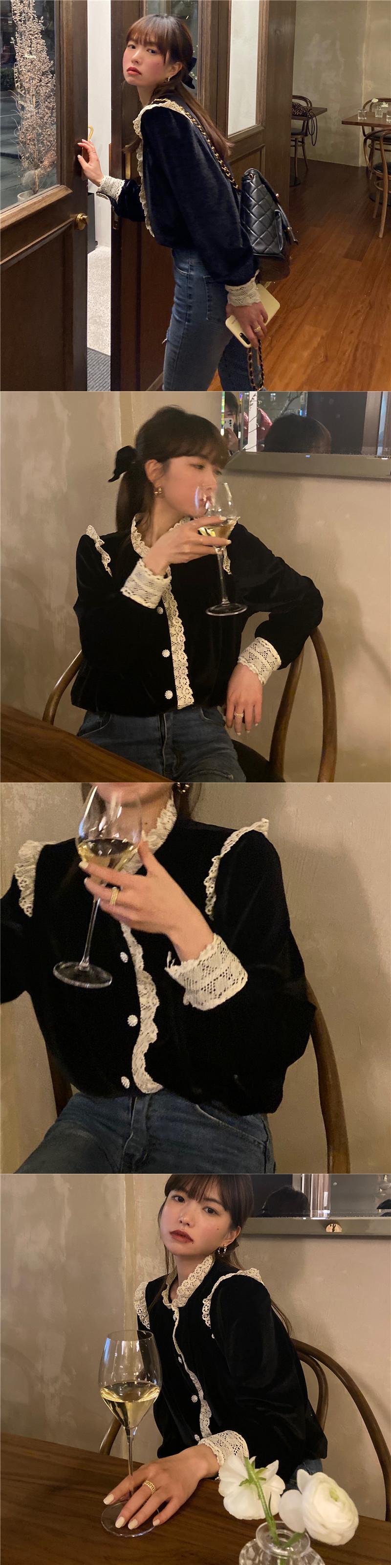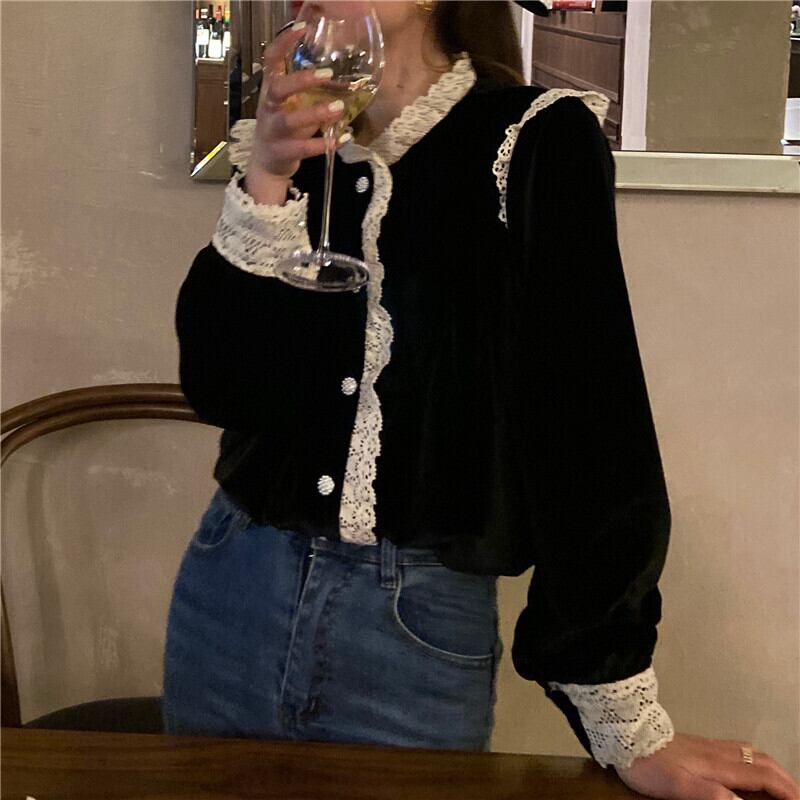 ベルベットシャツ レースブラックスプリングオータムスタイルトップス ロング 春物 秋物 ステッチ ブラックストロベリース26674919719