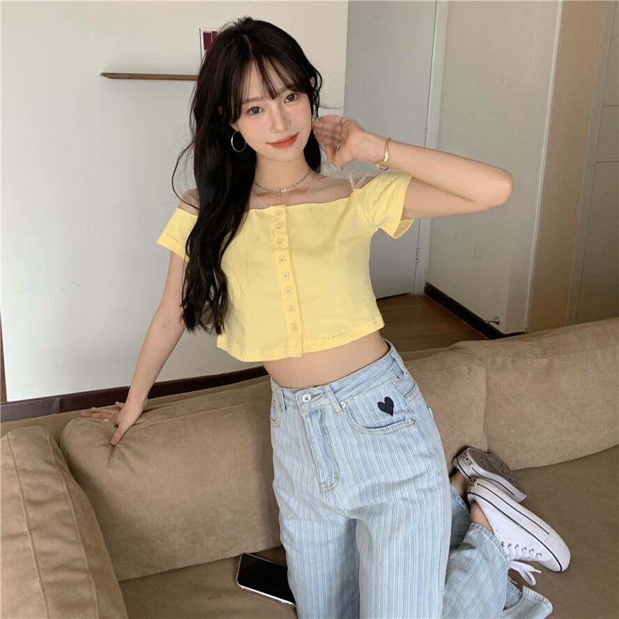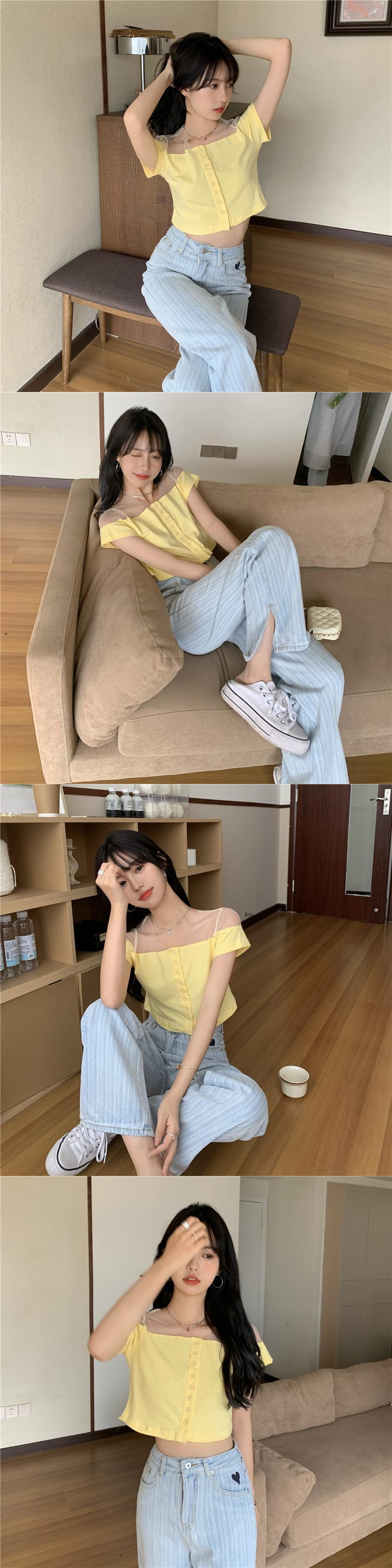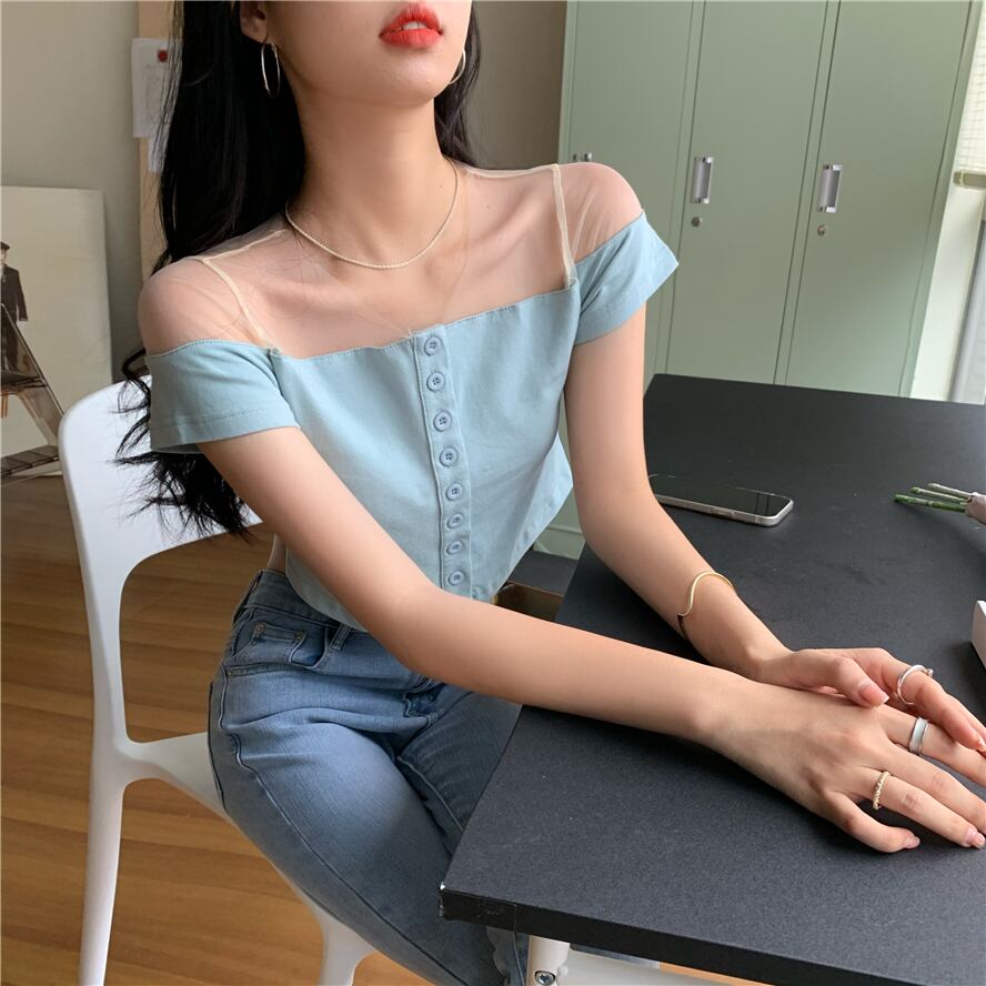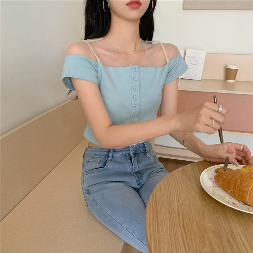 Tシャツ ブルーメッシュショートクロップドスリムトップス サマースタイル 夏物 ピュア ステッチ ブラックストロベリース18704731255