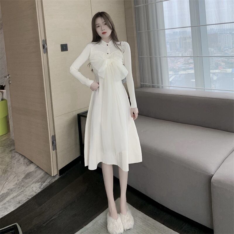 ニットドレス ホワイトスカート スプリング ロング 春物 ステッチ ブラックストロベリース49427571050