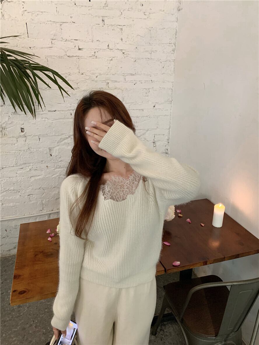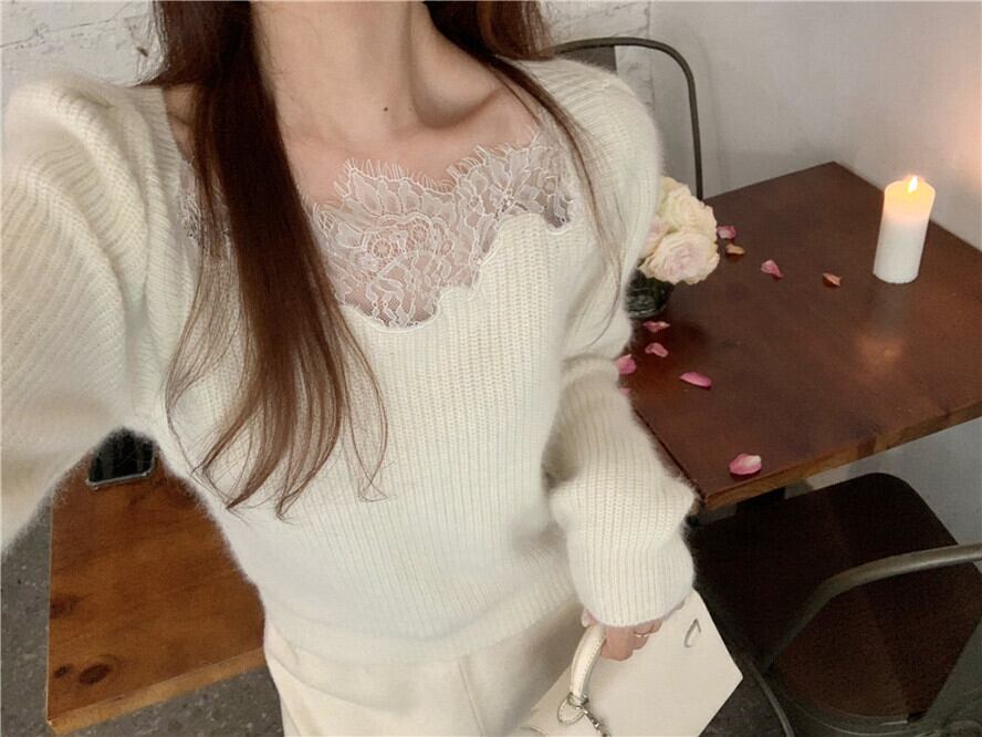 セーター シャツ レースVネックニットレディースオータムウィンターホワイトトップス ロング 秋物 冬物 ブラックストロベリース46453888692