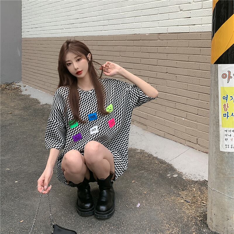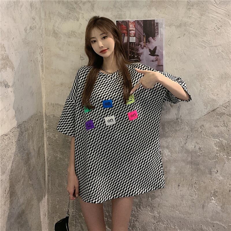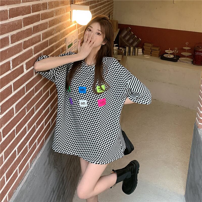 格子柄Tシャツ シャツ ルーズラウンドネックジャケット レディーススプリング 春物 Oネック ブラックストロベリース12406631724