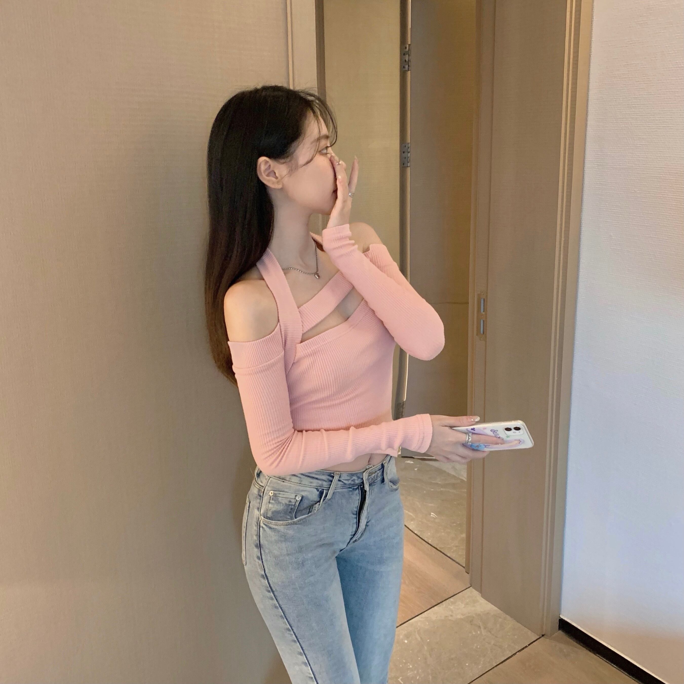 ニットセーター シャツ ホルターワンショルダーショートスプリングトップス ロング 春物 ブラックストロベリース67371370756