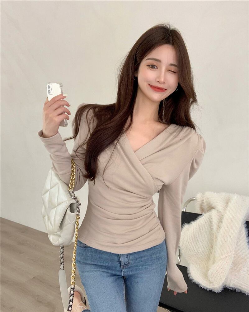 シャツ ベルベットスリーブトップス オータムウィンターVネックTシャツ ロング 秋物 冬物 ブラックストロベリース21766428481