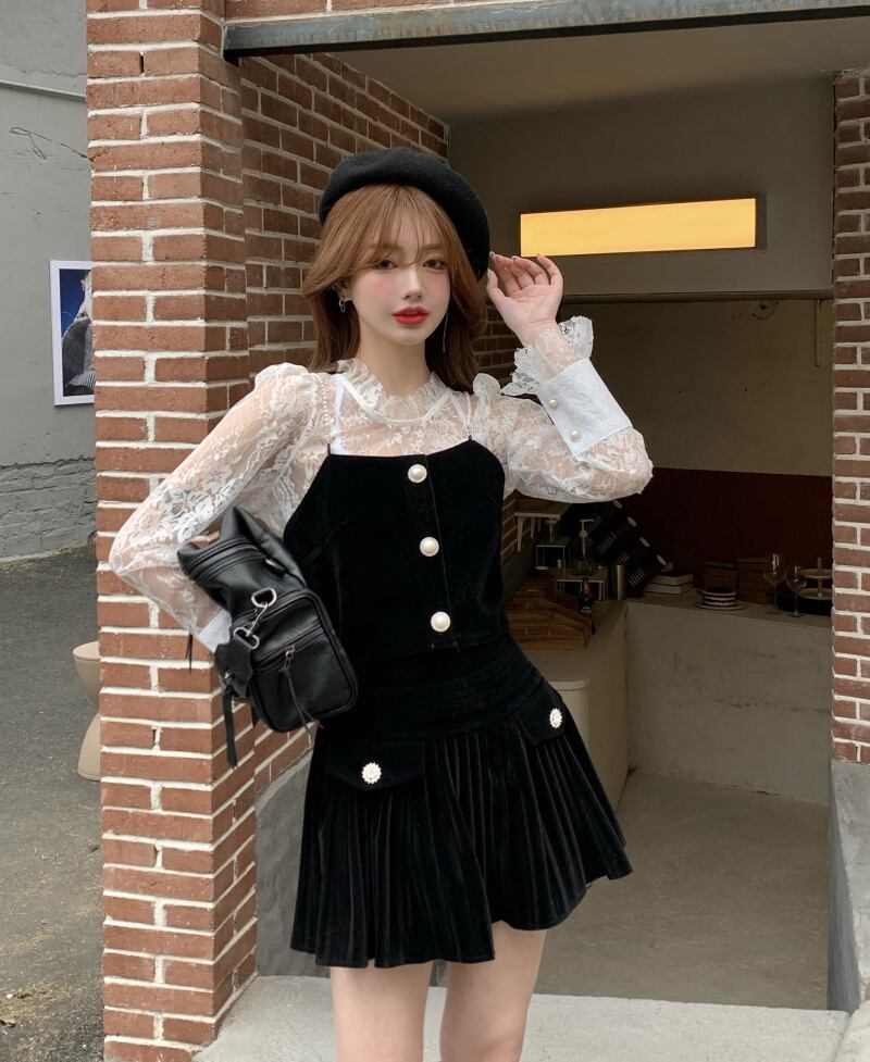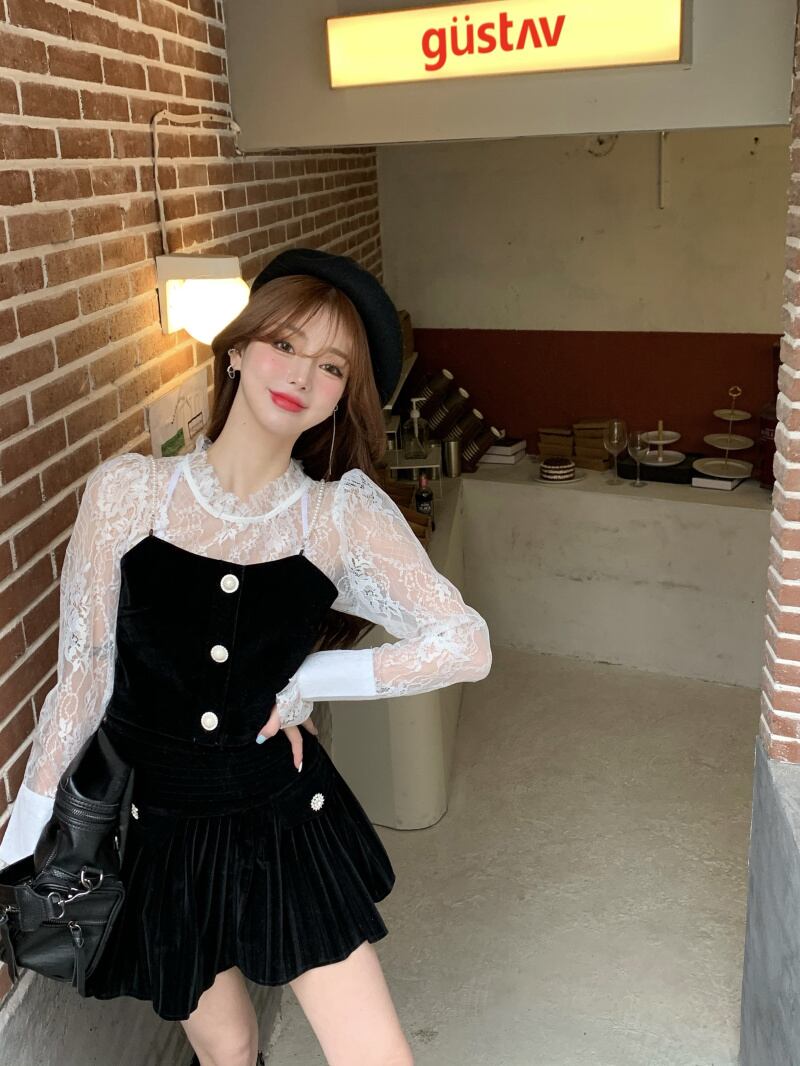 ドレス ブラックベルベットプリーツスカート スプリングスリムウェスト 春物 ブラックストロベリース60469632425