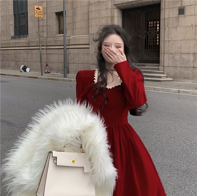 ドレス スタンダードスタイルカラースカート スプリングウェストスリム レトロ 春物 スクウェア ブラックストロベリース52354156103