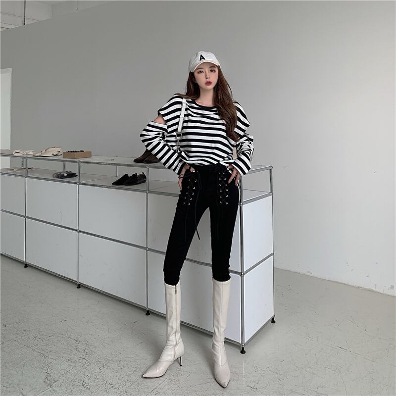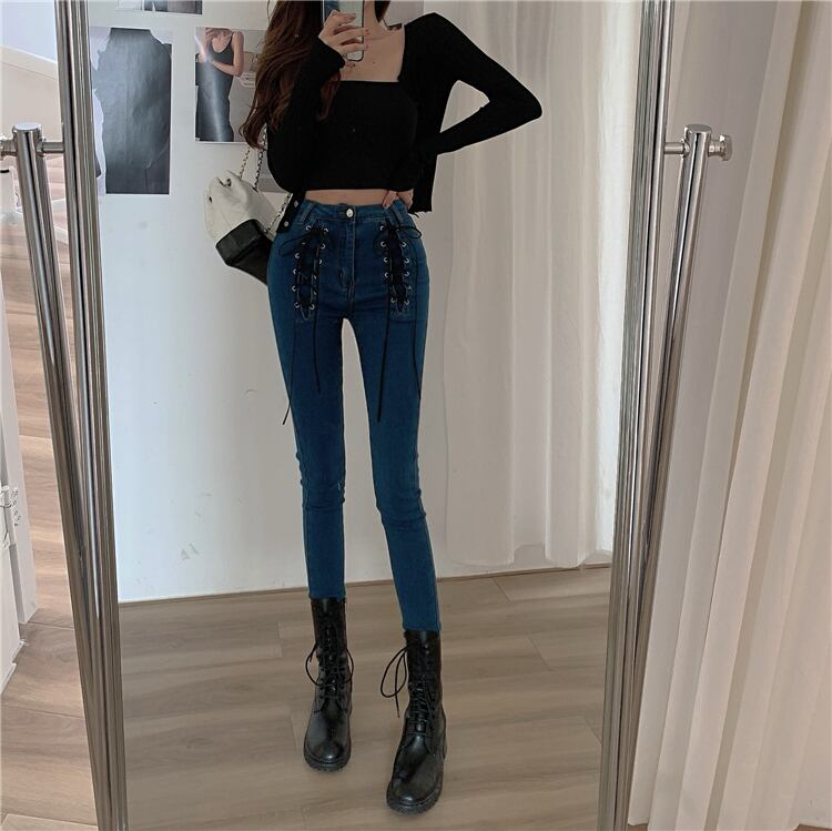 ジーンズ レディースオータムウィンターブラックハイウェストウェスト薄手パンツ 秋物 冬物 ブラックストロベリース89355369632