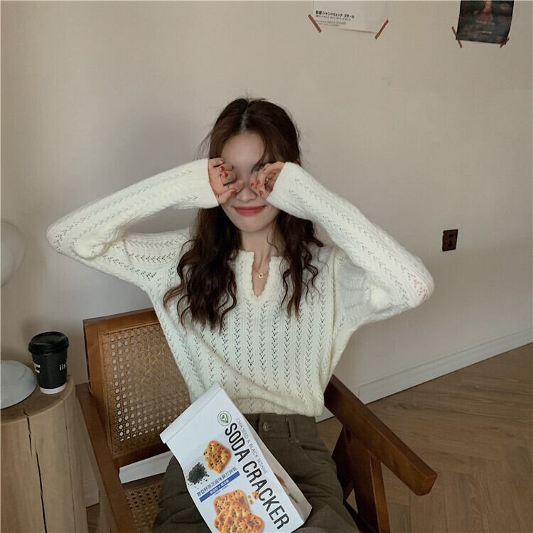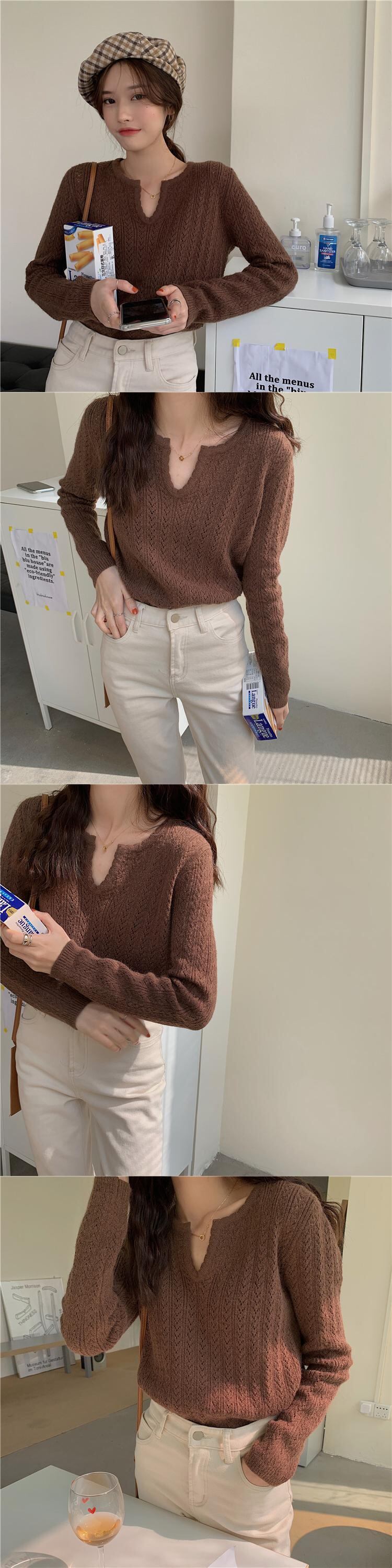 ニットスタンダードスプリングVネックトップス ロング レトロ 春物 ブラックストロベリース19958537704