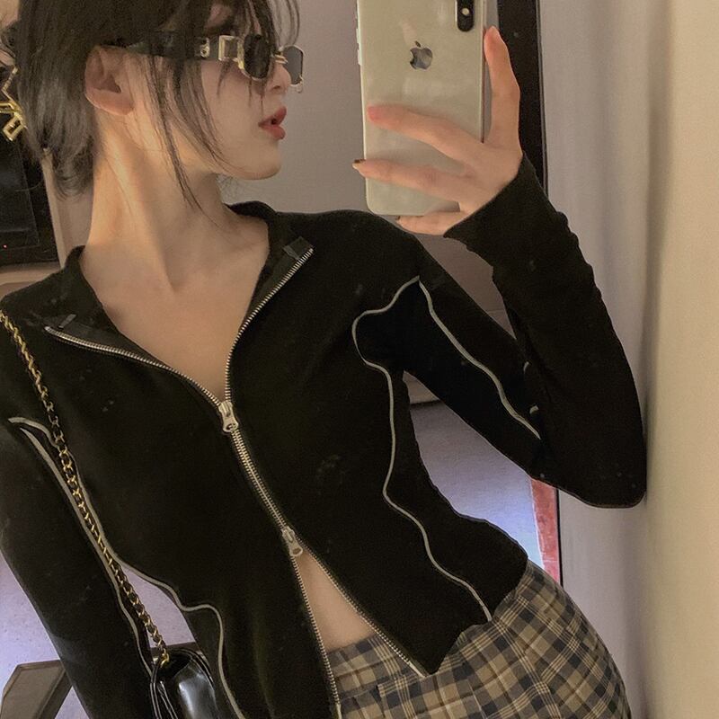 ブラックジャケット カジュアルショートジッパートップス スプリング 春物 ブラックストロベリース17504053982