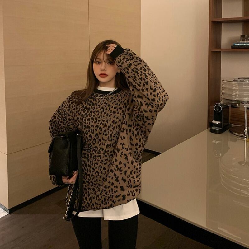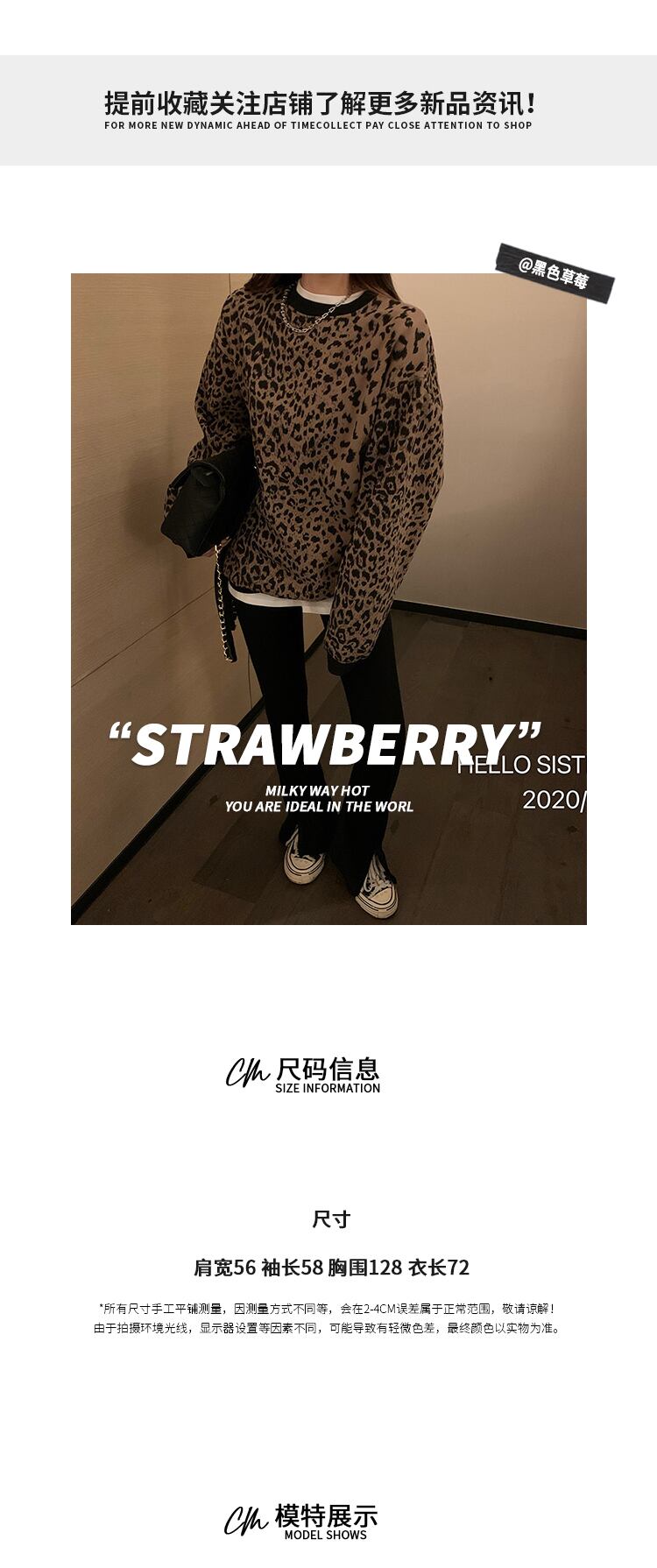 レオパードプリント柄セーター コート スタンダードルーズラウンドネックオータムウィンターベルベットトップス レトロ 秋物 冬物 Oネック ブラックストロベリース49991640021