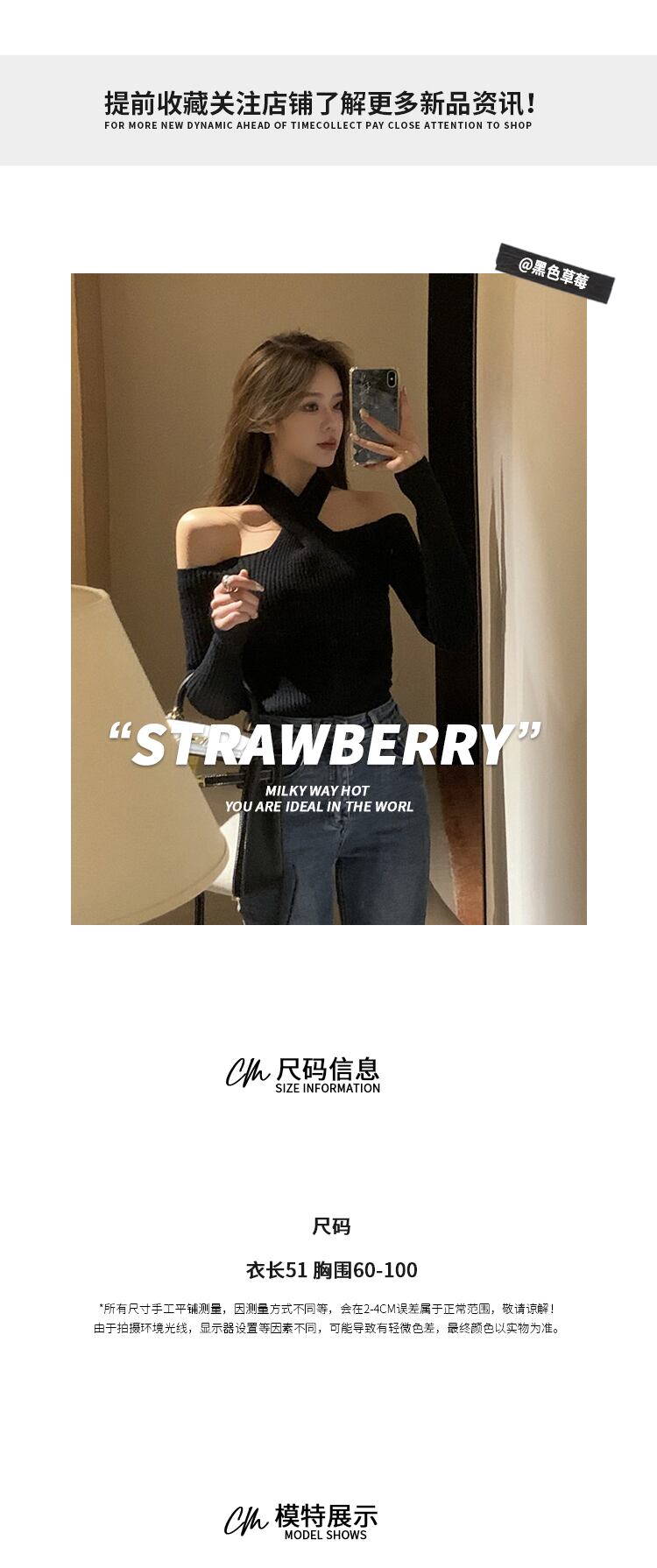 ニットシャツ ストラップレススタイルショートセーター スプリングブラックトップス ロング 春物 ブラックストロベリース69611997669