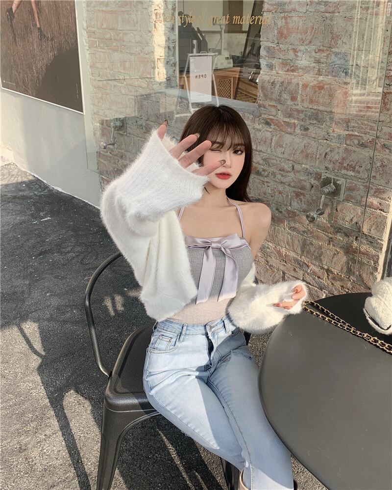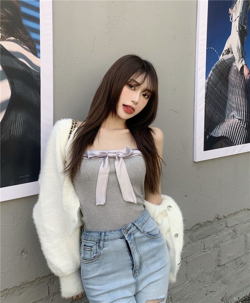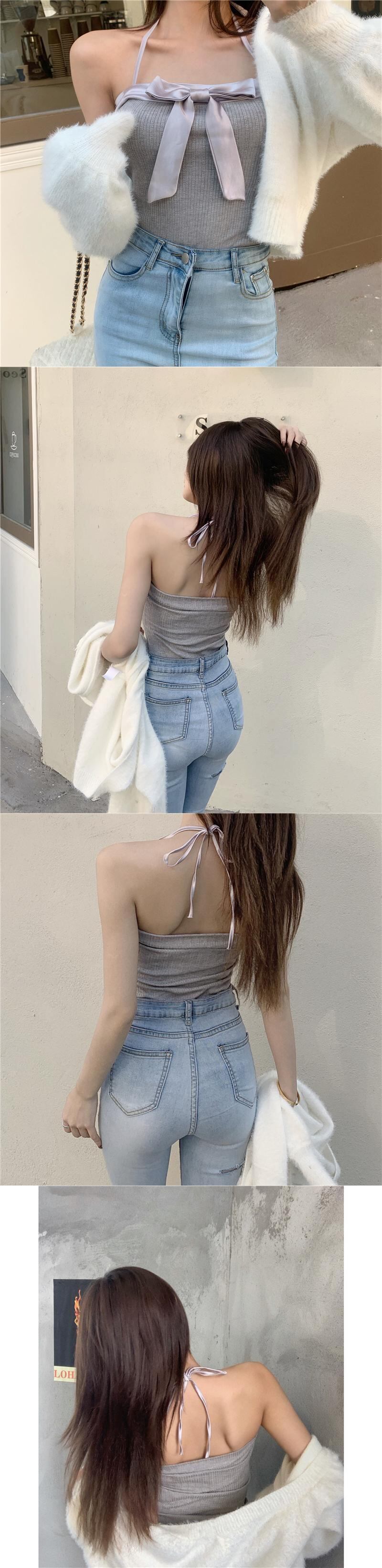 ニットサマーリボンショートトップス ホルターシャツ 夏物 ブラックストロベリース64899240604