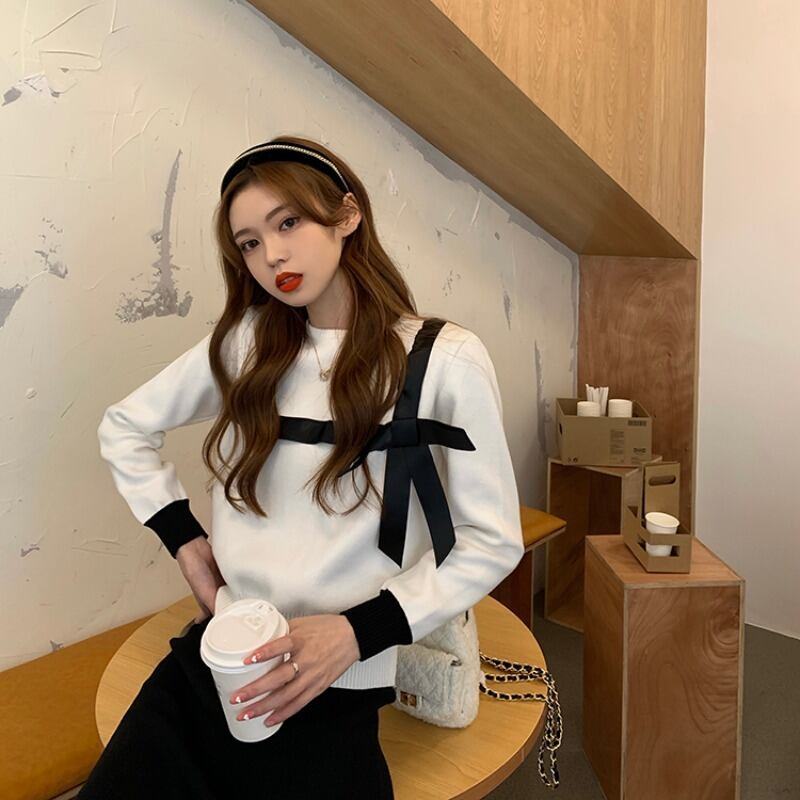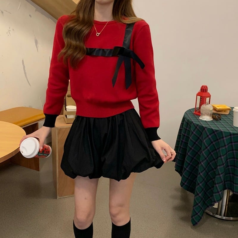 ニットセーター リボンショートスタンダードレッドシャツ スプリングスリムトップス レトロ 春物 ブラックストロベリース39612823055