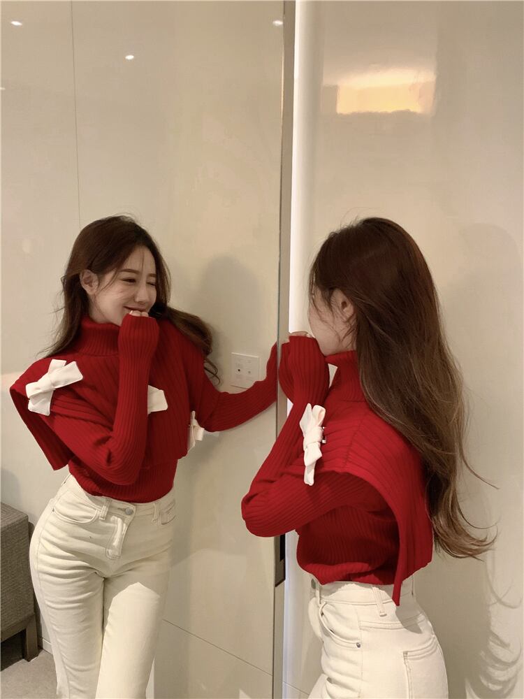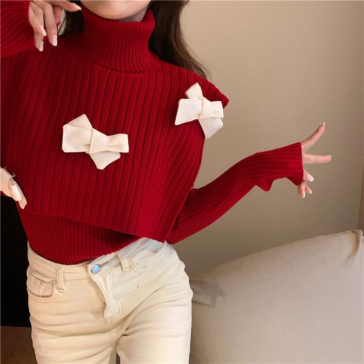 ニットシャツ リボンショートセーター レディーススプリングレッドトップス ロング 春物 ブラックストロベリース4758299222