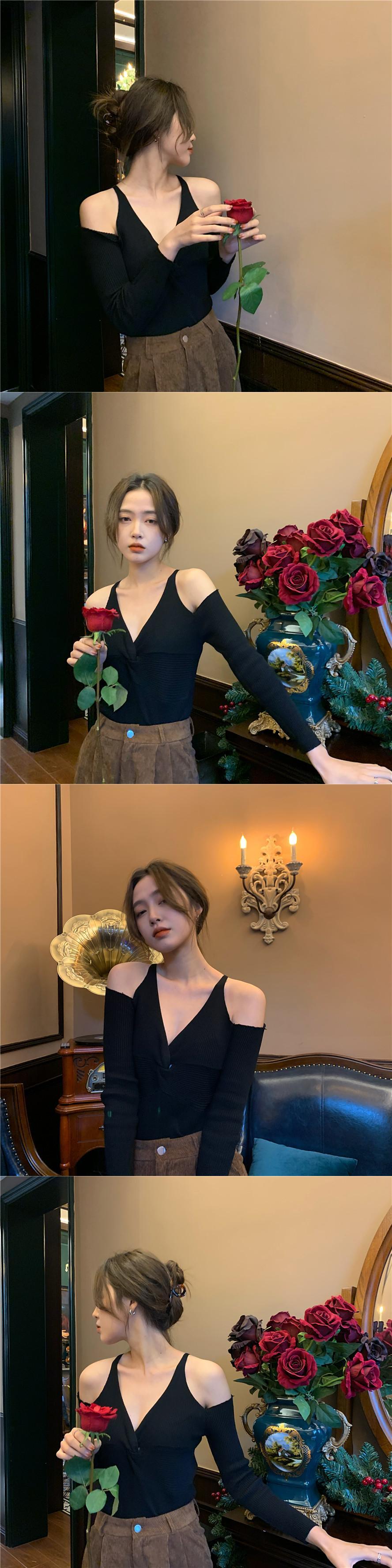 ニットシャツ Vネックショートセーター スプリングブラックトップス ロング 春物 オフショルダー ブラックストロベリース5701503051