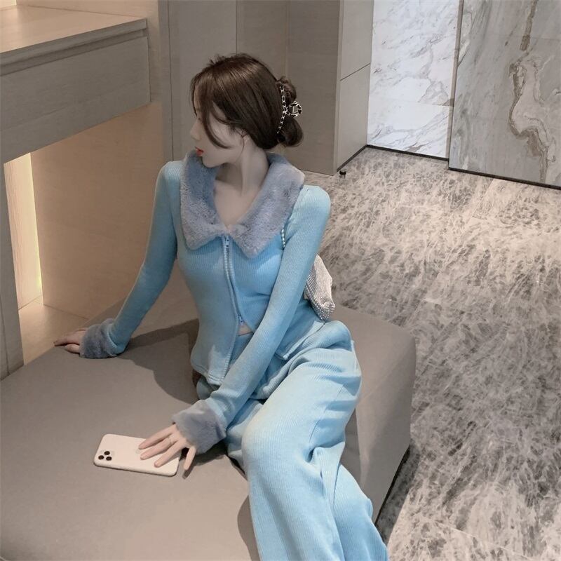ニットセーター カーディガンコート ジッパーファーカラースリムショートスプリングトップス ロング 春物 ブラックストロベリース52051911739