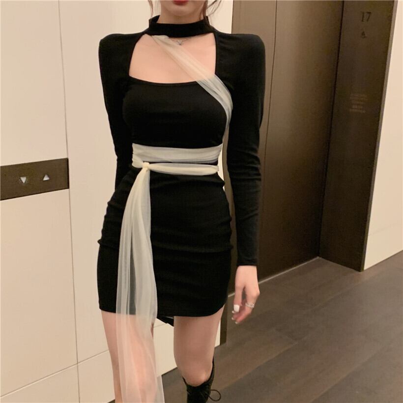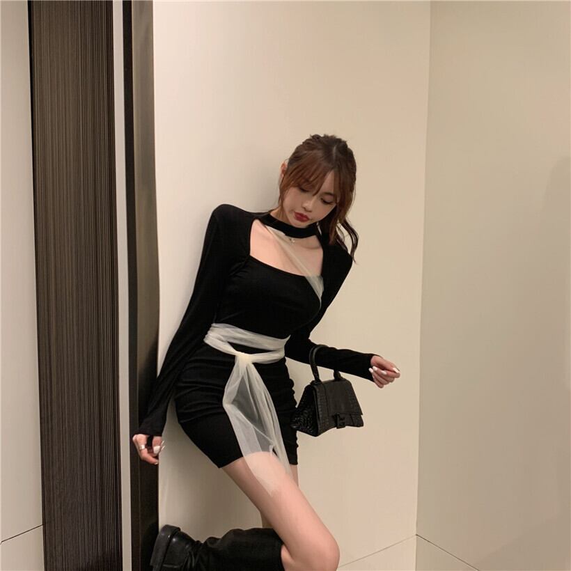 ドレス メッシュウェストスリムブラックロングショートスカート スプリング 長袖 春物 ブラックストロベリース2664118210