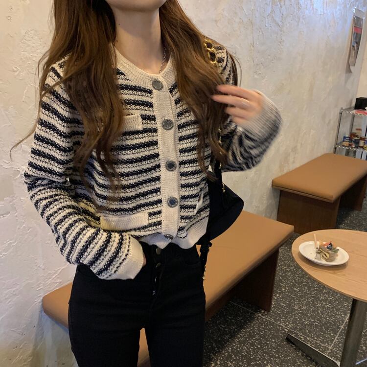 ニットショートカーディガンストライプスタンダードルーズセーター ジャケット スプリング ロング レトロ 春物 ブラックストロベリース34651734872