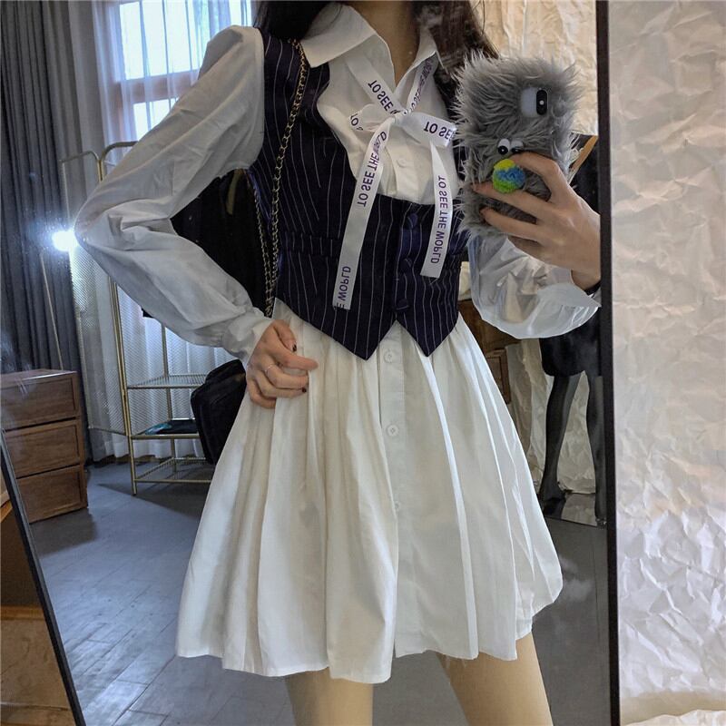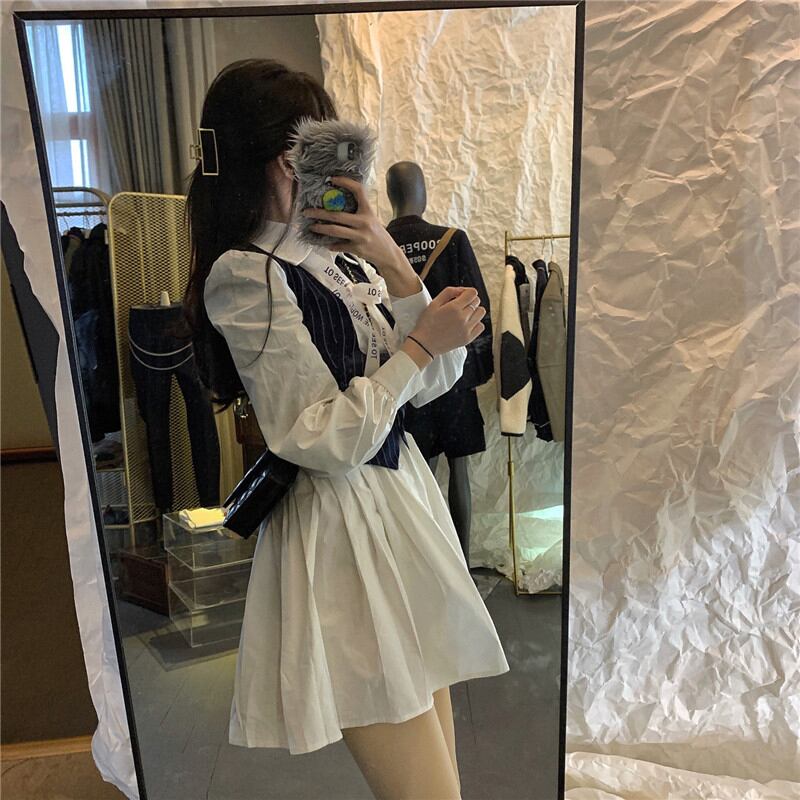 ドレス ウェスト薄手ホワイト長袖スリーブシャツ ショートスカート スプリングスタンダード ロング レトロ 春物 ブラックストロベリース74044778687