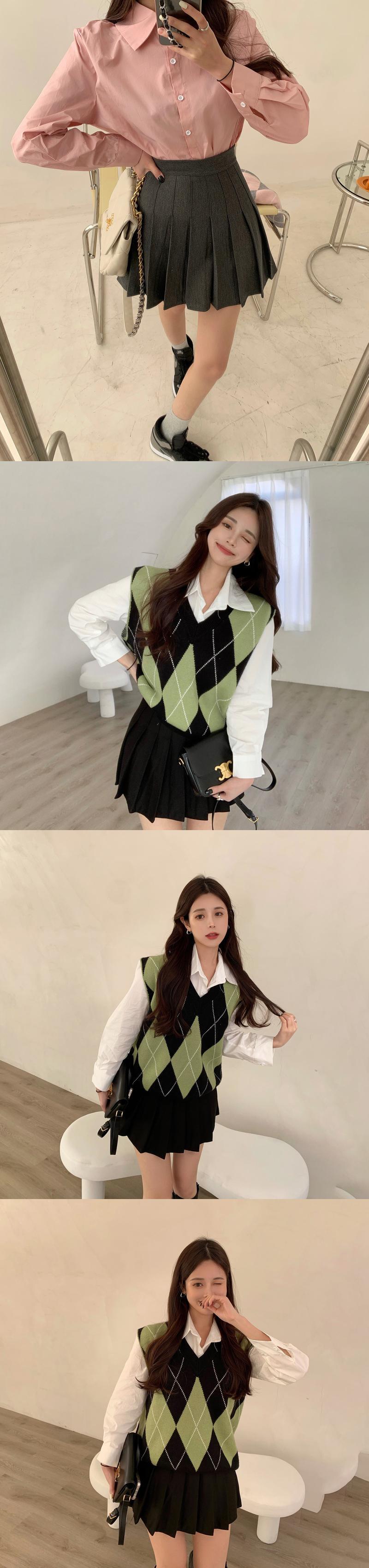 色:ピンクのベスト,グリーンベスト,ピンクのシャツ,白のシャツ,黒スカート,グレースカート