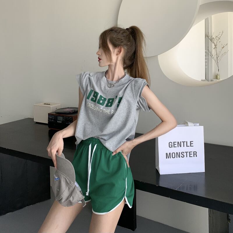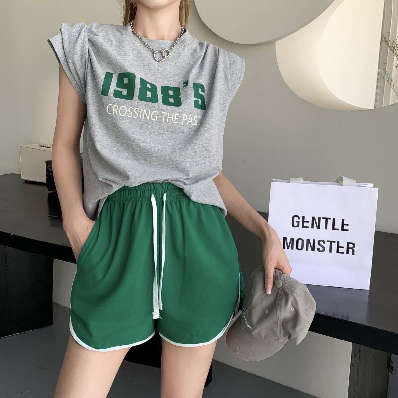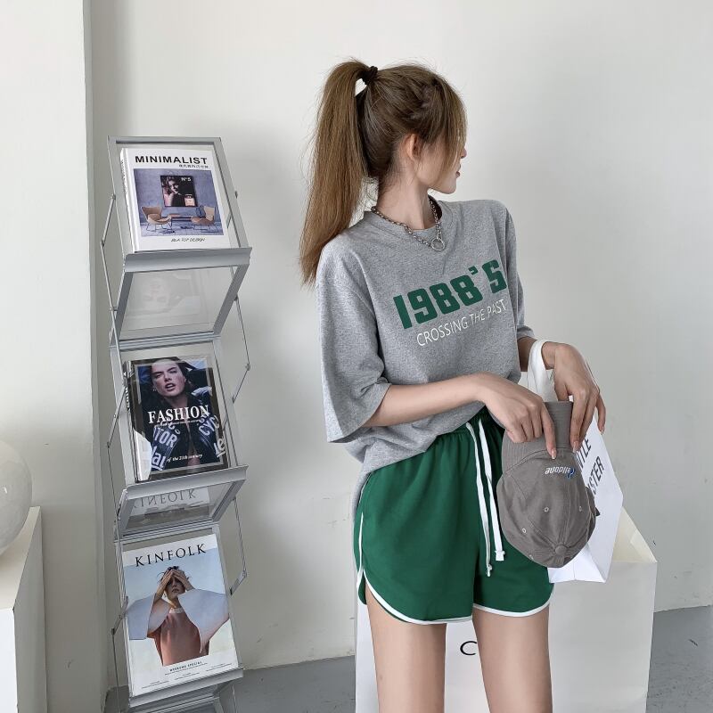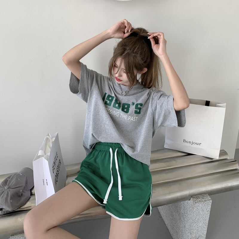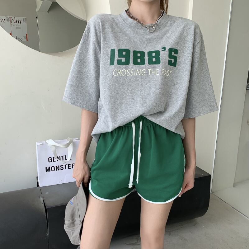 ブラックプリント柄ラウンドネックTシャツ トップス ショーツ カジュアルパンツ ブルマー Oネック ブラックストロベリース52914007586
