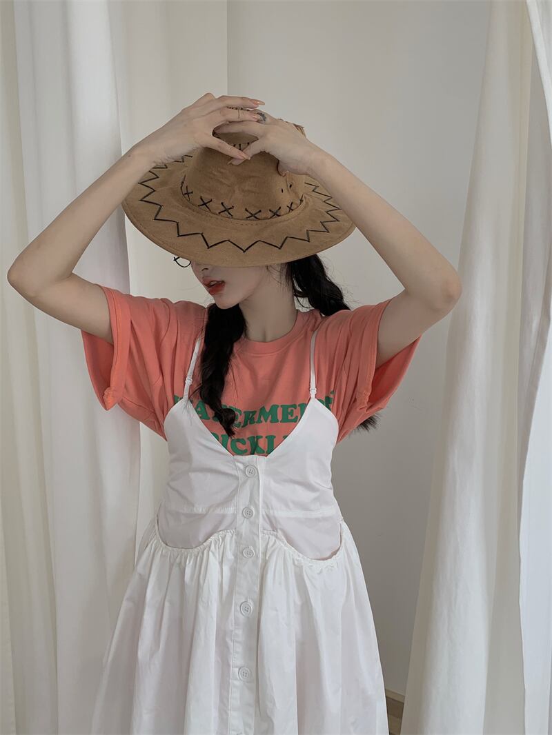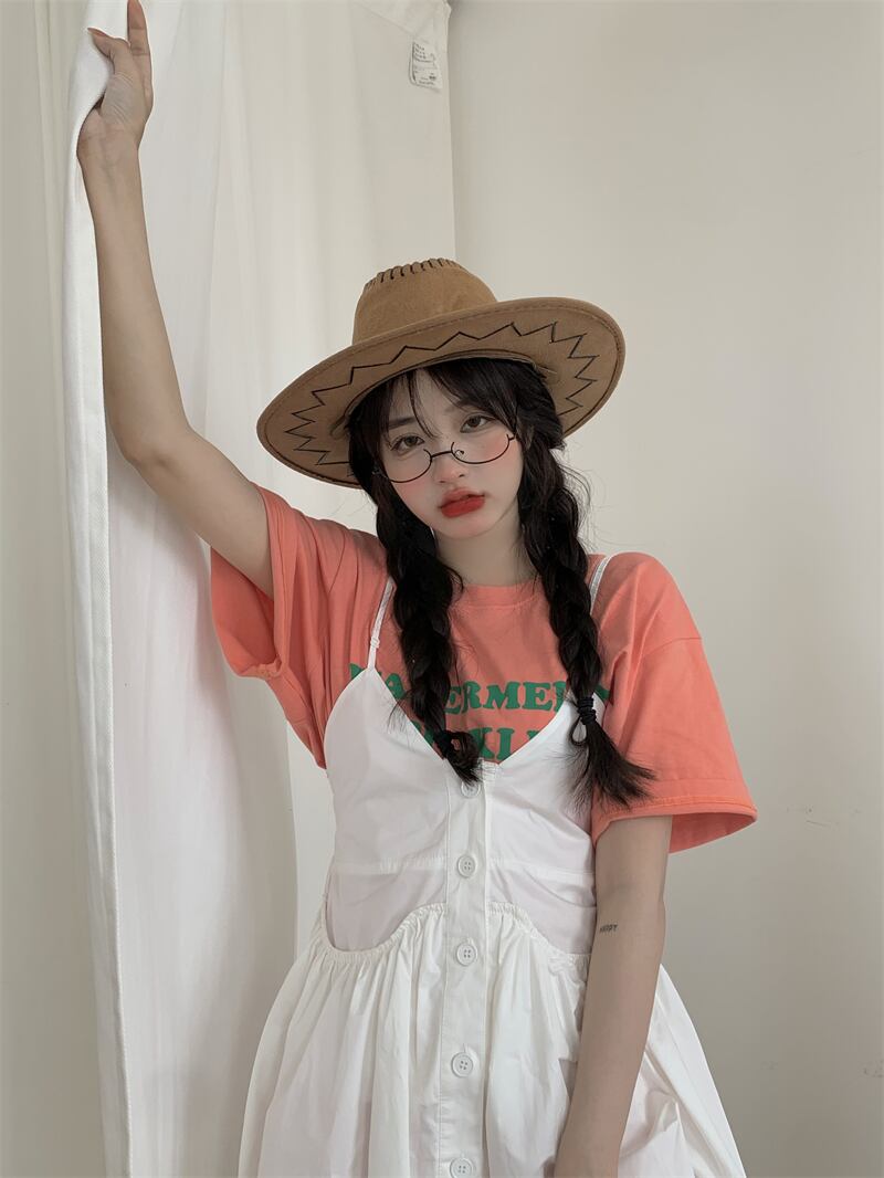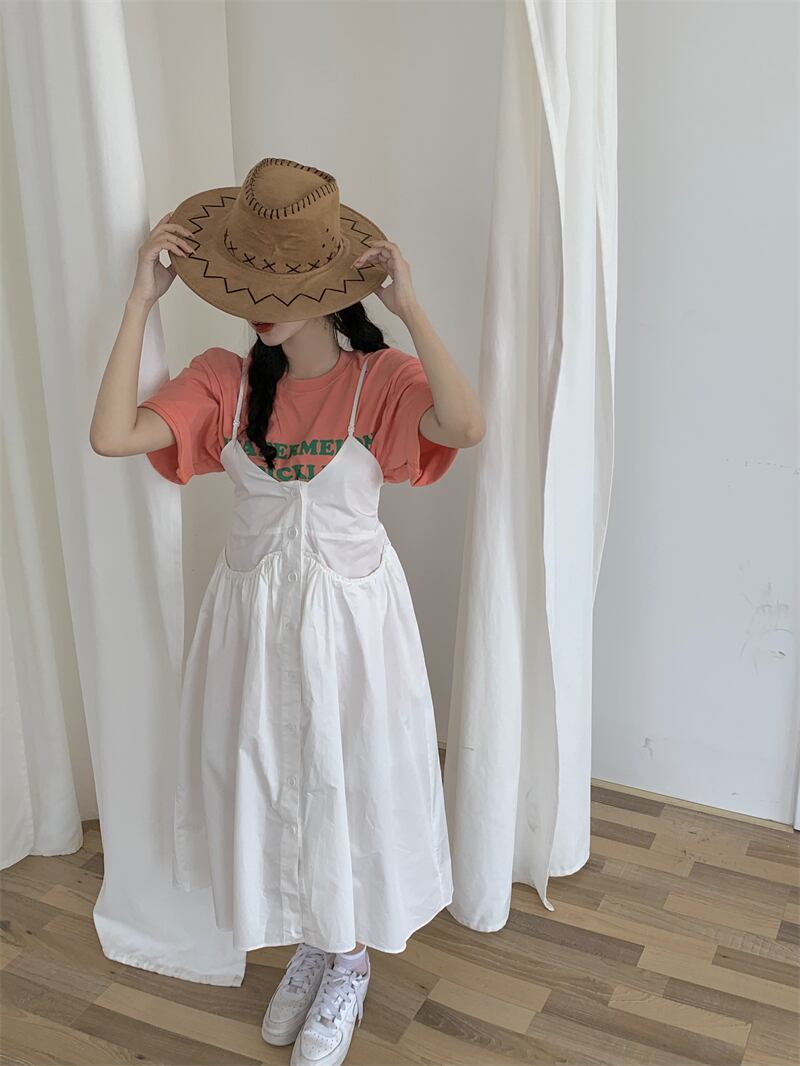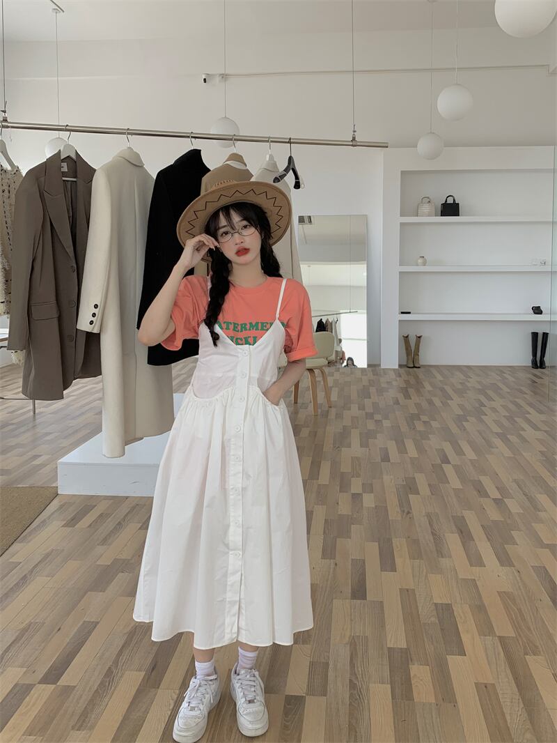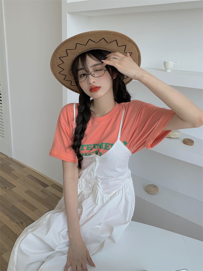 色:ピンクの文字T,ホワイトサスペンダードレス