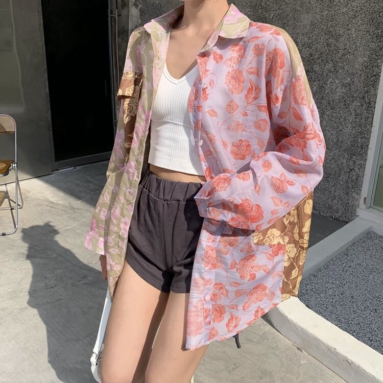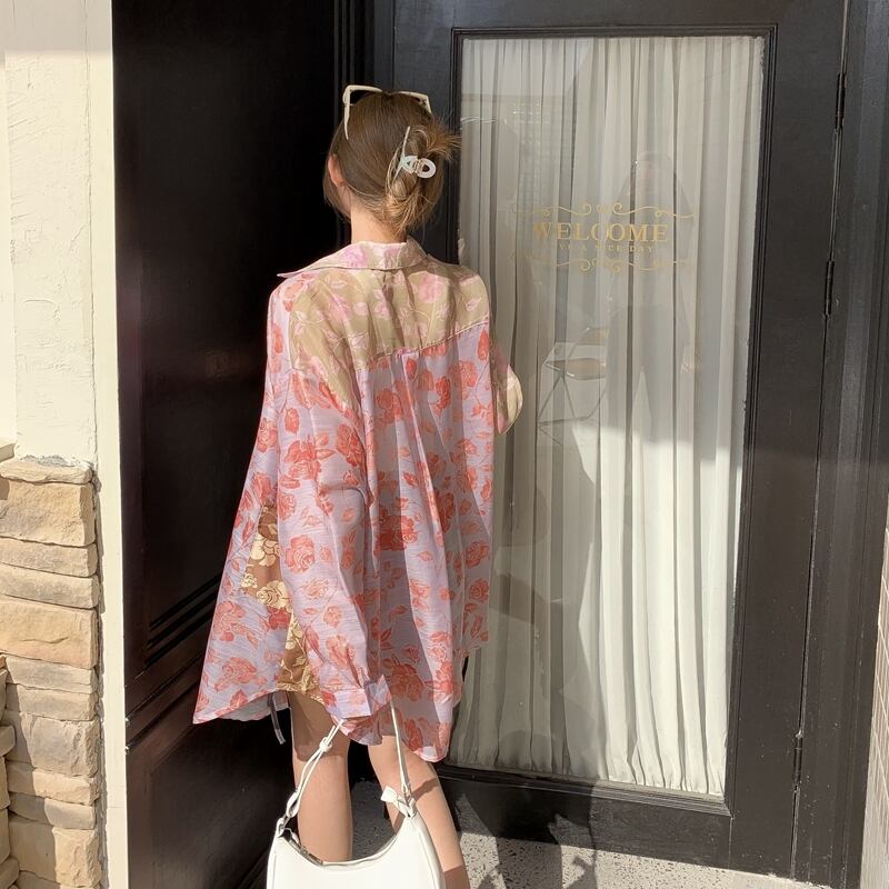 シャツカラーフローラルジャケット サマー薄手トップス ロング 夏物 花柄 ブラックストロベリース62223256180