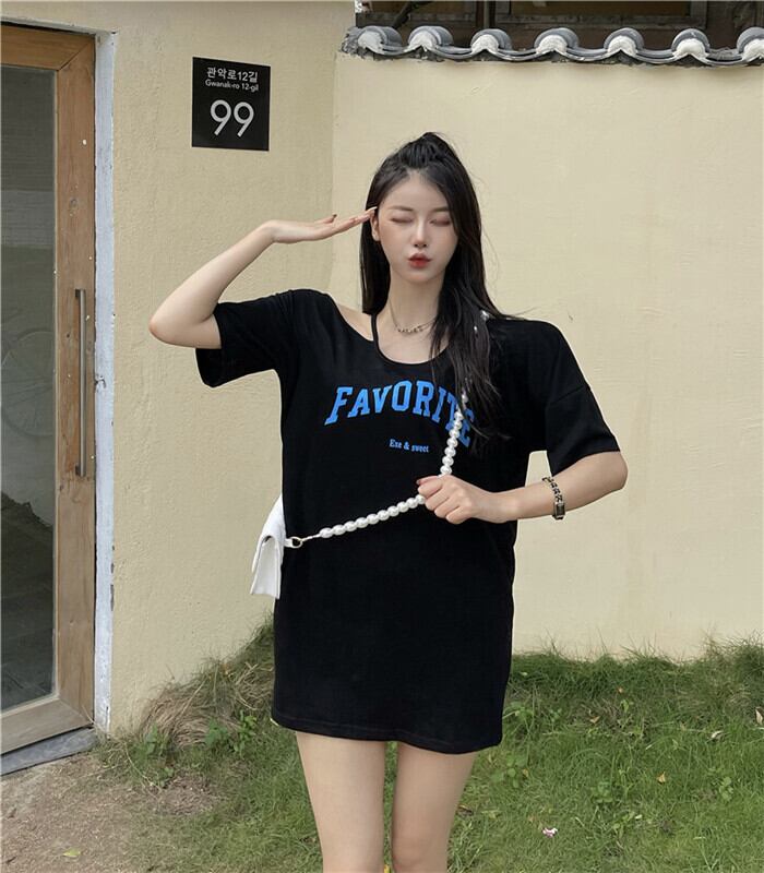 Tシャツ サマースタイル薄手ルーズホワイトトップス 夏物 オフショルダー ブラックストロベリース78398994556
