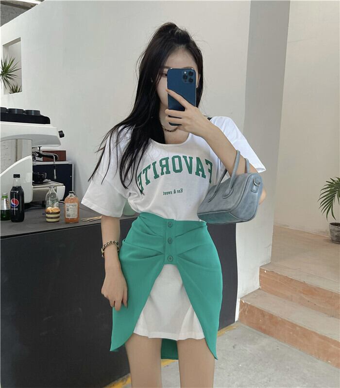 色:白いTシャツ,黒いTシャツ,青いスカート,緑のスカート