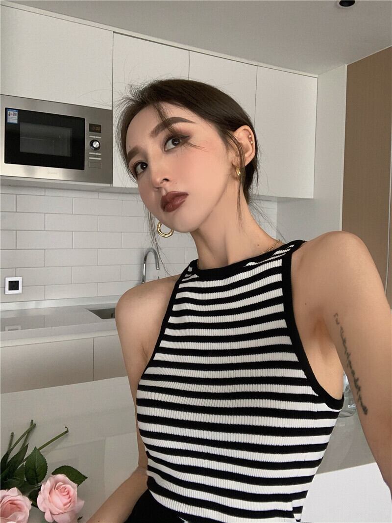 スタンダードストライプニットレディースサマーショートコート レトロ 夏物 ヨーロピアン ブラックストロベリース74736987452