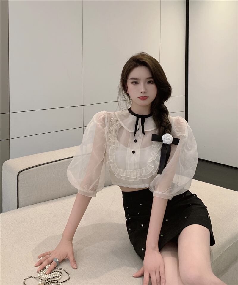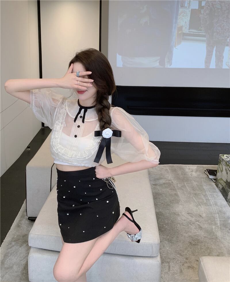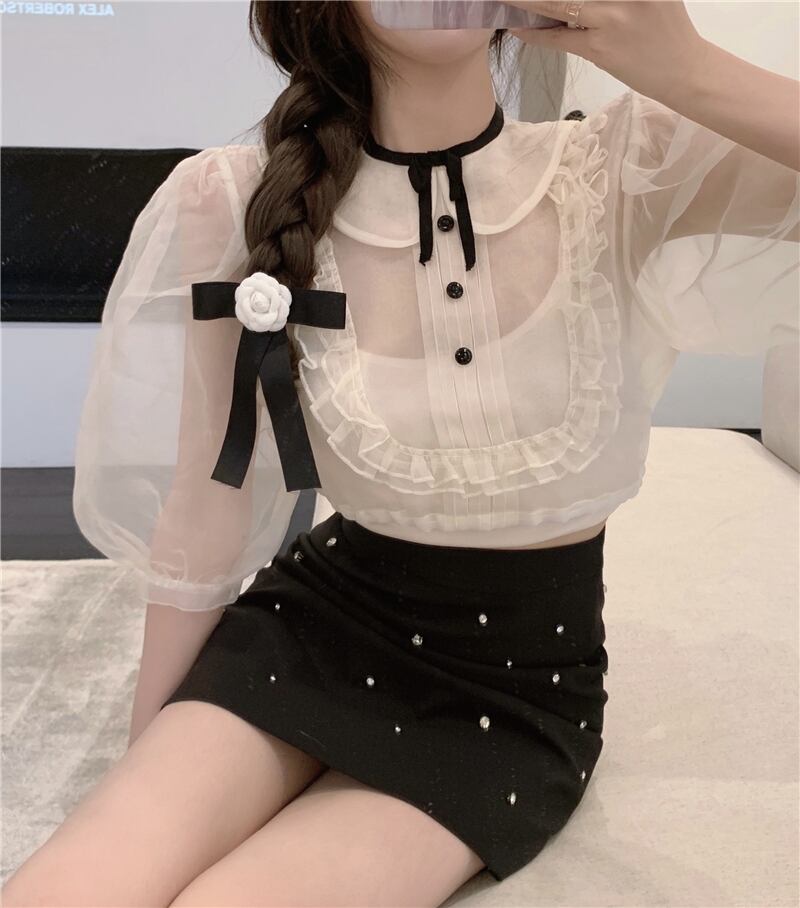 メッシュシャツ スタイルスリーブカラーリボンサマーショート レース 夏物 ブラックストロベリース51921968615