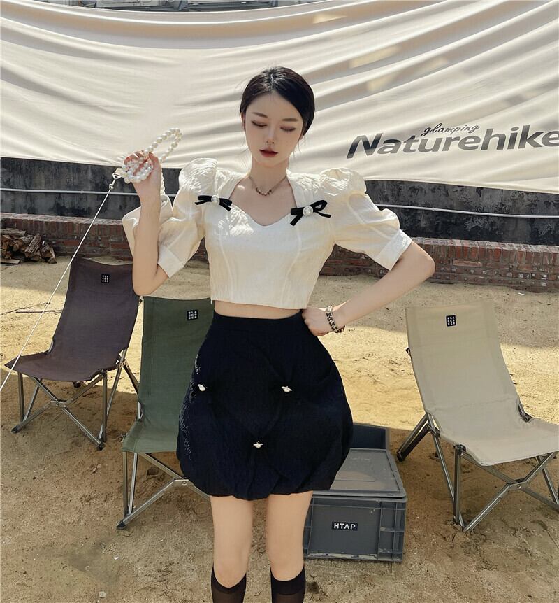 カラー半袖スリーブシャツ サマーホワイトトップス ショート リボン ハーフスリーブ 夏物 スクウェア ブラックストロベリース27184108528