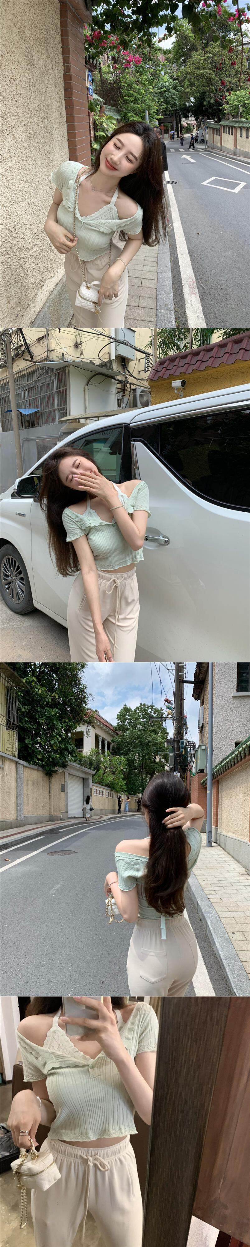 ニットセーター ショートスタイルスリムグリーン薄手トップス サマー 夏物 ピュア ブラックストロベリース29526056562