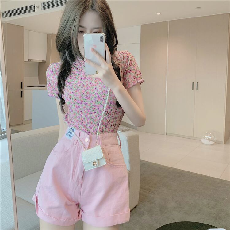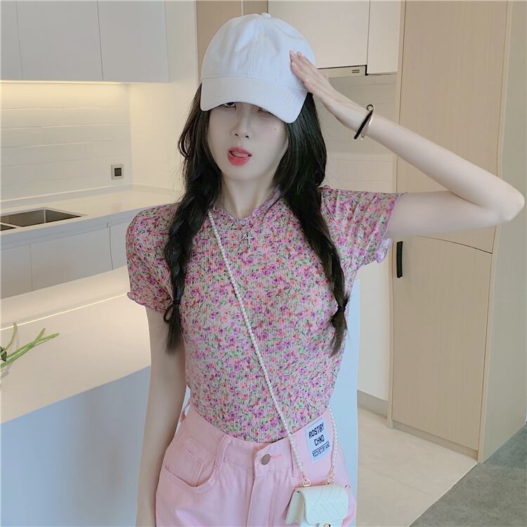 Tシャツ フローラルショートトップス ピンク 花柄 ピュア ブラックストロベリース91130556072