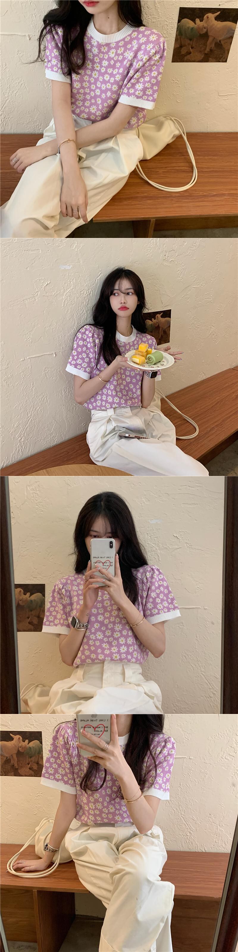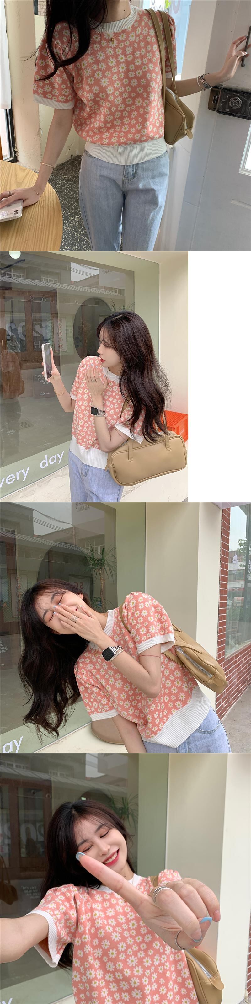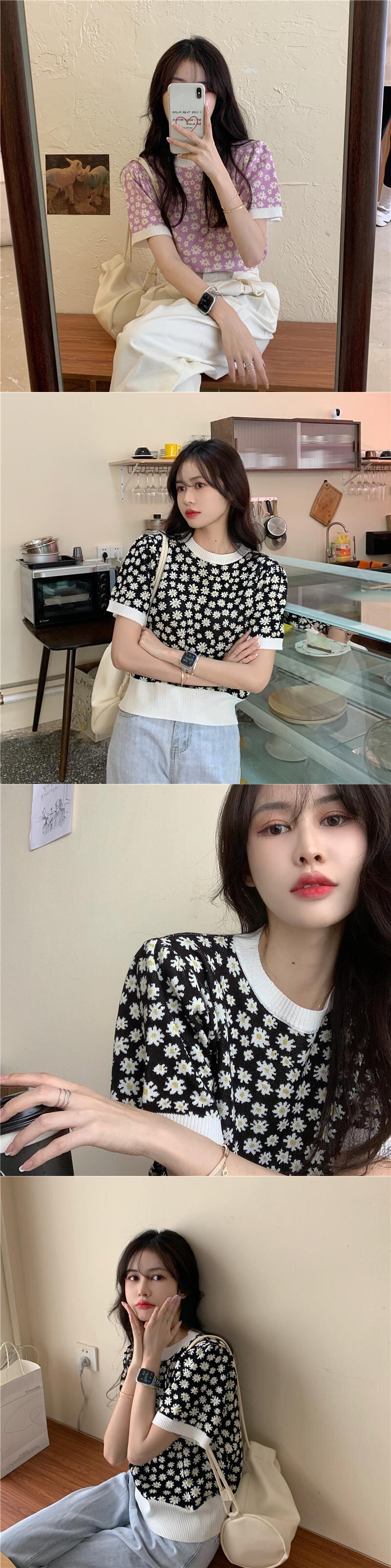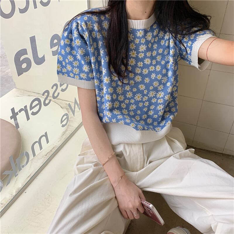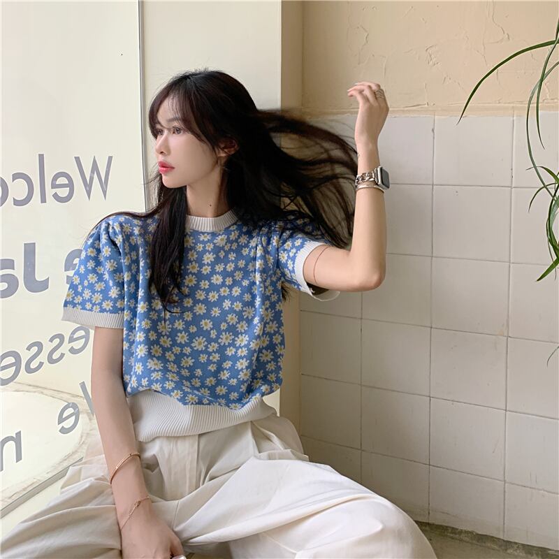 フローラルニットセーター ルーズブルーショート薄手トップス サマー 夏物 花柄 シルク ブラックストロベリース34189952229