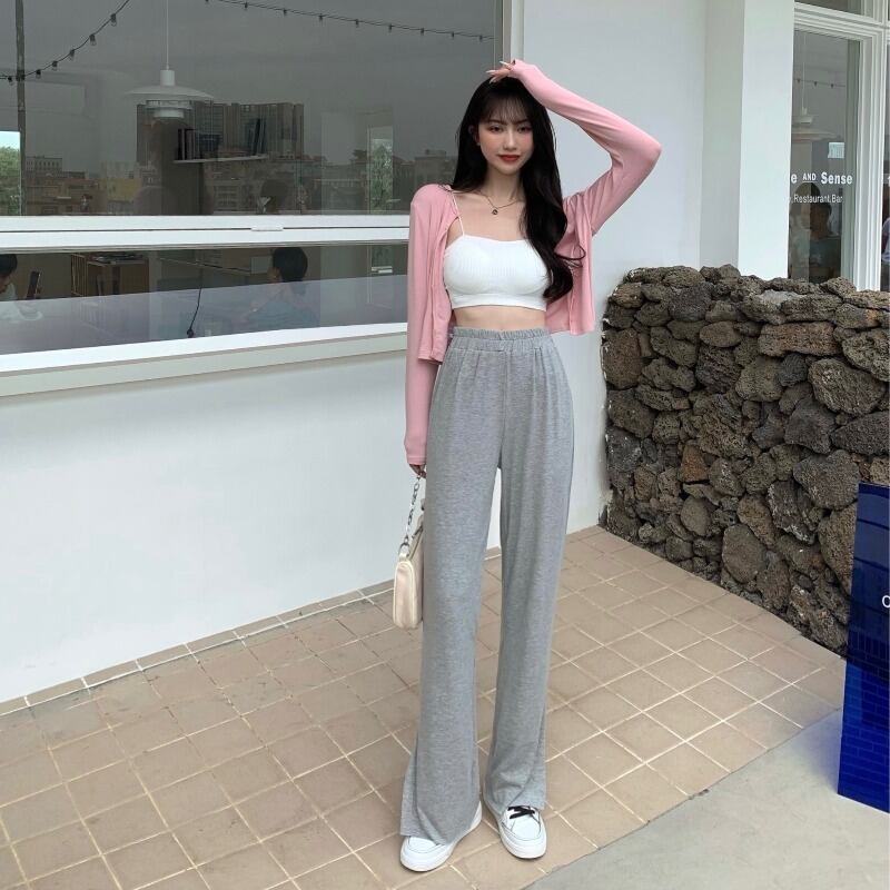 色:白いチューブトップ,ピンクのカーディガン,グレーパンツ